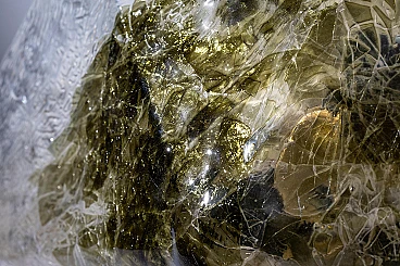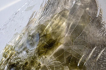 Large pyramid-shaped ceiling lamp, produced by La Murrina in the 1970s, in Murano glass with inclusions in shades of green and amber. The ceiling attachment is a large brass plate, visible in the photo. The electrical system is coeval and in working order.