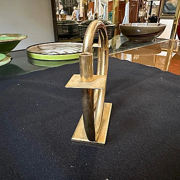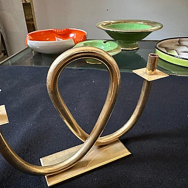 An elegant brass candelabra designed and made in the manner of Gio Ponti by Il Re Metallo is an excellently crafted piece that reflects the elegance and simplicity of mid-century modern design. The candelabra features a unique and elegant design with two candleholders positioned symmetrically on either side. It has a fluid, ring-like structure that creates a visually attractive and dynamic shape, reminiscent of Gio Ponti's signature style. The base is rectangular and solid, providing a stable foundation for the candelabra. Made of high-quality brass, the candelabra has a warm, golden hue that enhances its luxurious appearance. The brass material has a polished finish that enhances its reflective qualities and gives it a sophisticated appearance. While primarily decorative, the candelabra is also functional: it is designed to hold two candles. Its elegant design makes it a versatile piece that can complement both modern and traditional interiors.