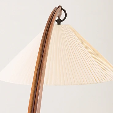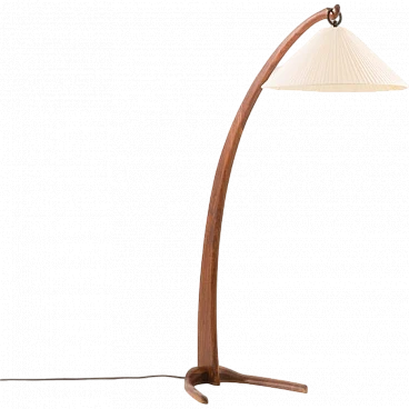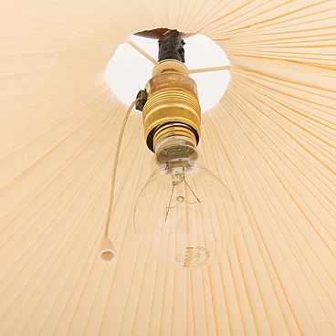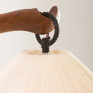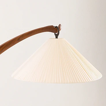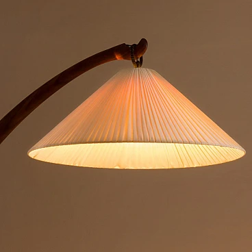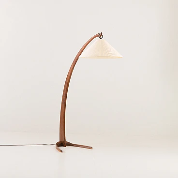 A large arched floor lamp with a handmade shade was designed in the late 1950s and 1960s in Italy. The exquisite rarity of this design lies in the use of organically bent walnut wood, a feature rarely seen in contemporary times. This aesthetic finds affinity with famous designers such as Carlo Mollino, Gio Ponti, Ico Parisi, Max Ingrand and Angelo Lelii, who embraced the philosophy of organic design. The lampshade consists of cotton strips wrapped around a metal frame. It was handmade and remade according to the original. The lamp underwent a complete restoration, which included rewiring for greater functionality and a new switch. The wood was carefully cleaned, sanded and protected with professional compounds to enhance its beauty. After this restoration, the lamp will last for decades and be a beautiful addition to any interior. Lampshade height 24 cm, lampshade diameter: 60 cm, cable length 270 cm. Requires an E27 bulb.