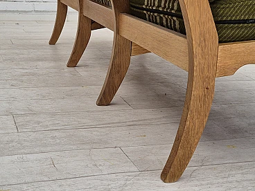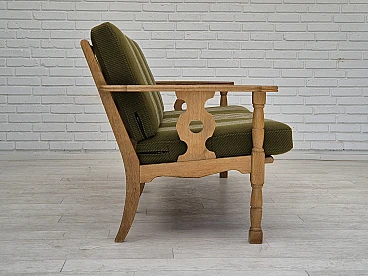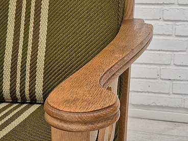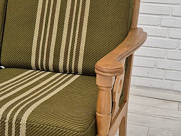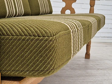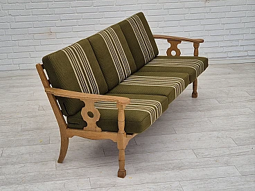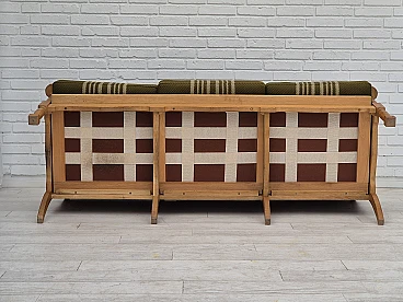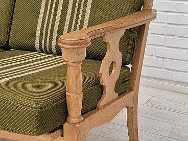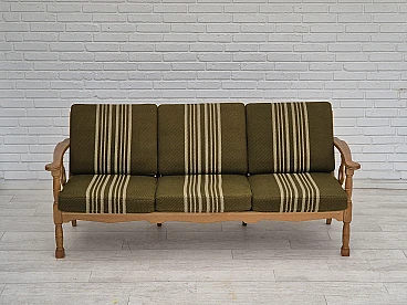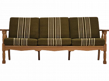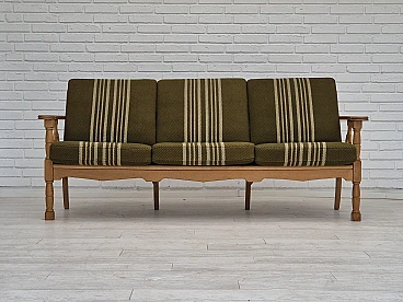 Danish three-seater sofa from the 1970s in original condition: no odours, no stains, stable construction. Sofa checked by craftsman. Green furniture wool, solid oak. Springs in the cushions. Produced by a Danish furniture manufacturer around the 1970s.