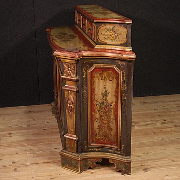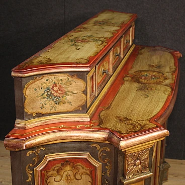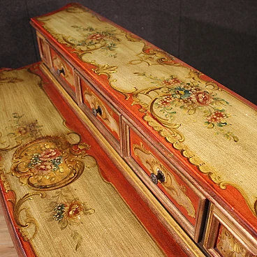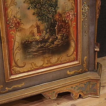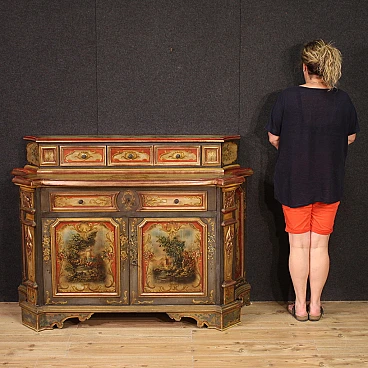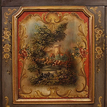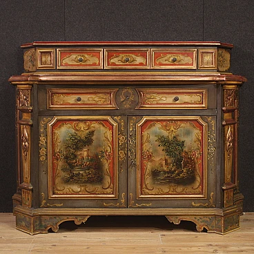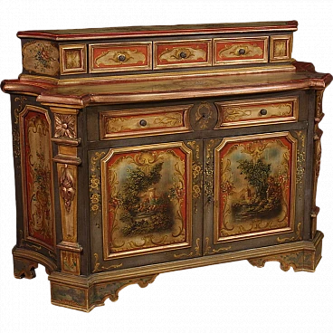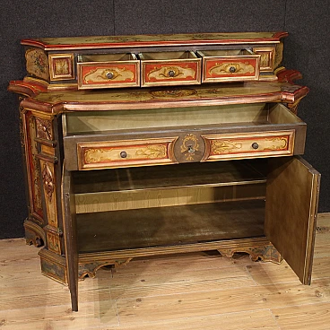 Veneto sideboard from the second half of the 20th century. Carved, lacquered and hand-painted wooden cabinet with floral decorations and landscapes with architecture on the doors. Sideboard with two doors and a capacious drawer in the lower body (see photo). Upper body (attached to the base) complete with three small drawers (see photo). Hall or salon furniture, of fabulous decoration and good service, for antique dealers and interior decorators. Sideboard fitted with two working keys and an internal shelf. Shows some signs of wear and minor colour fading. Structurally sound piece of furniture, overall in good state of preservation.