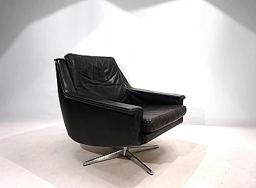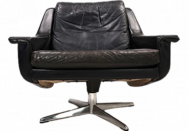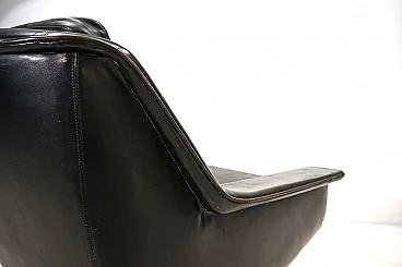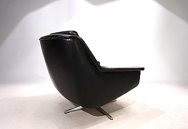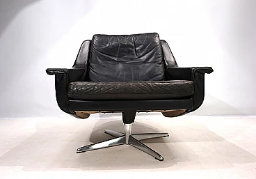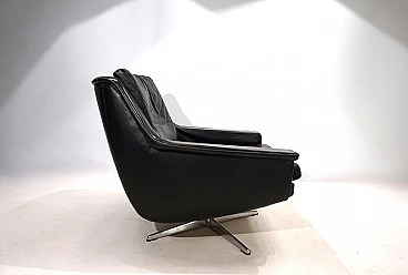 This black leather armchair 802 from ESA is in good condition with a noticeable patina. The black leather of the cushions is soft, shows minimal signs of wear and makes a very good impression. There are signs of wear on the armrests and the back of the armchair, patina on the cushions and rubbing of the leather on the corner and the inside of one armrest. The armchair can be rotated 360 degrees and rotates perfectly.