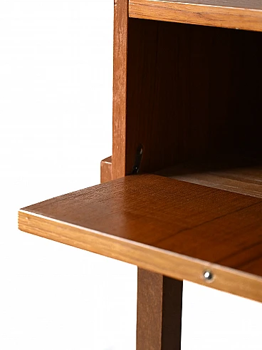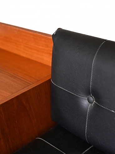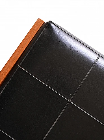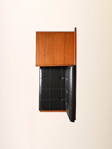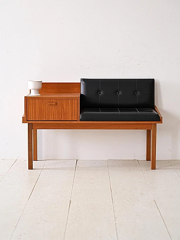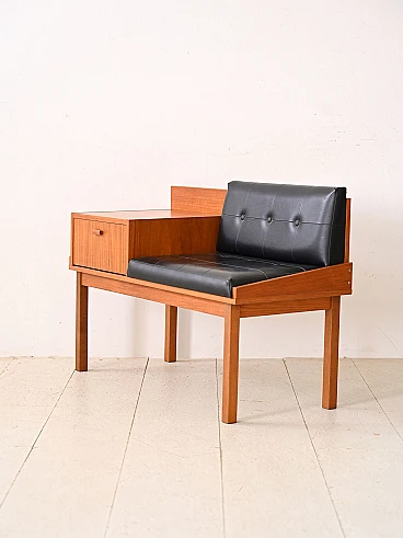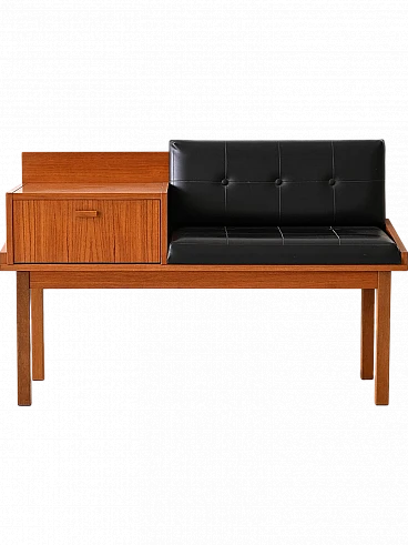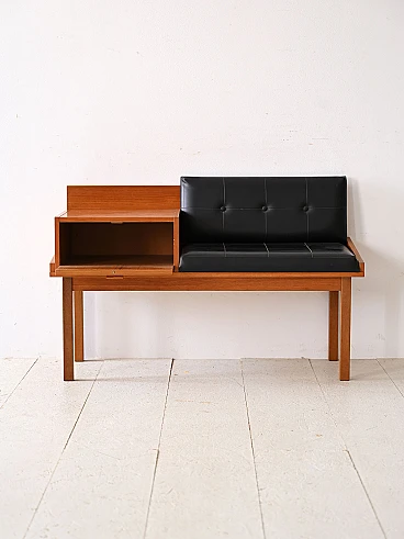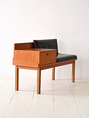 Scandinavian bench with upholstered seat and raised drawer. This original piece of Scandinavian furniture has a unique and modern configuration. Called the 'gossip chair' because it is used as a telephone stand. On one side, the seat is padded and upholstered in soft black leatherette, offering comfort and an elegant appearance. On the other side, there is a drawer raised above the top, ideal as a shelf for the telephone or other small objects. Perfect for adding character and making the entrance hall or bedroom unique. Good condition. A conservative restoration was carried out using natural materials. May show some signs of time. Please pay attention to the photographs.