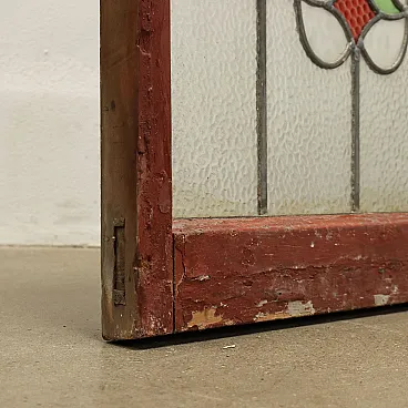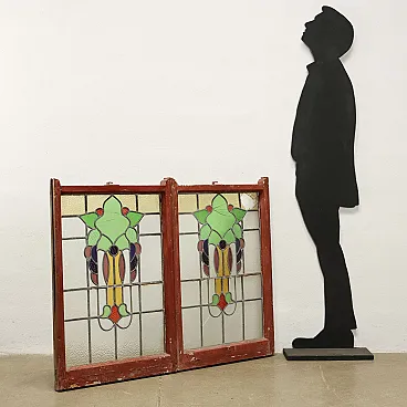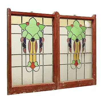 Pair of Art Nouveau leaded and stained glass windows with flowers