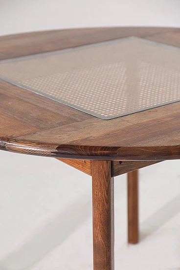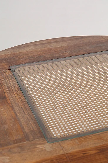 The round top is a true masterpiece: in the center, it features a refined weave of Vienna straw, adding a touch of lightness and tradition. This element is further enhanced by a clear glass surface that not only protects the underlying straw but also creates an interesting play of transparency and reflections, highlighting the beauty of the woven pattern. The table legs, also made of wood, are rotated inward at a 45-degree angle, providing stability and adding a touch of originality to the overall design, which harmonizes perfectly with the aesthetics of the piece. This table is not just a functional element but also a piece of furniture that tells the story and taste of an era characterized by distinctive design and attention to detail. Perfect for enriching any space with a touch of vintage and sophisticated style.
