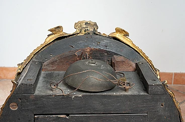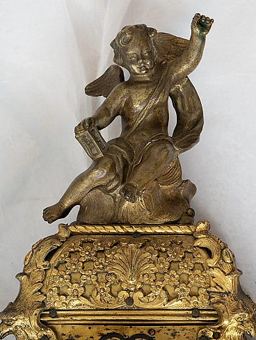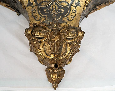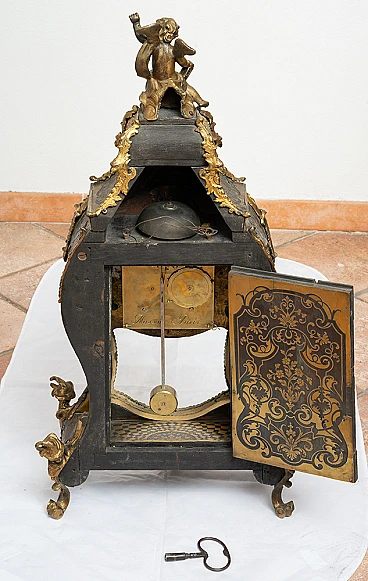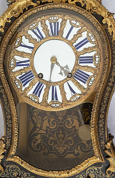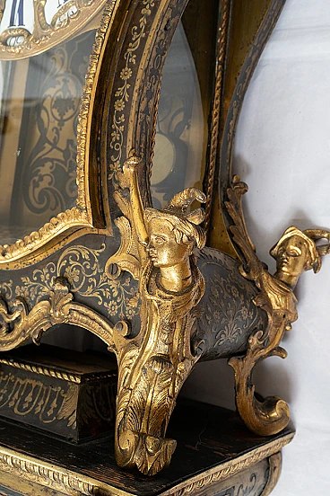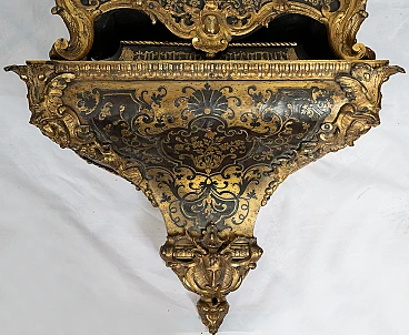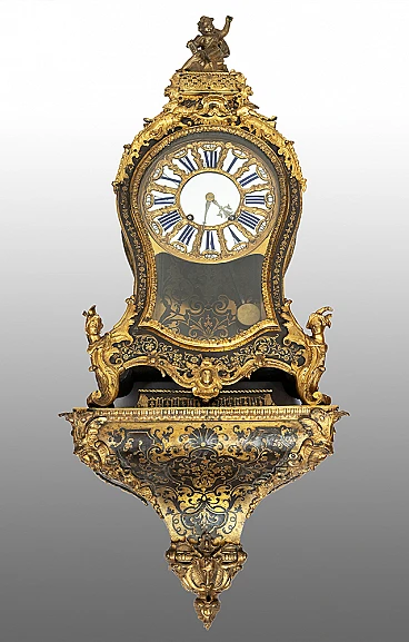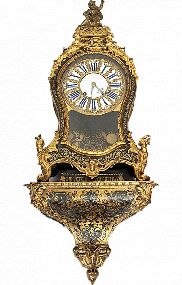 Antique wall cartel clock with shelf, signed Denis Masson in Paris, inlaid in the Boulle manner in gilded metal on a black background, gilded and chased bronze trimmings and sculptures, surmounted by a sculpture of a "Winged Putto". Louis XV era. The clock rests on a coeval shelf and presents an exceptional curved and tapered design with a splendid bronze mount with scrolls. The front elevation features a large white enamel dial with Roman numerals surrounded by beautifully chiselled maiden heads.
