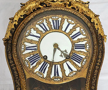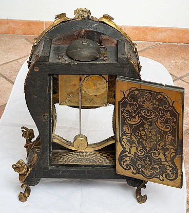 The clock is raised by very elegant feet with elaborately detailed scrollwork designs running along the scalloped front and down to the smooth central cabochon. Mechanism in need of overhaul.
