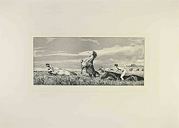 Pursued Centaur (Verfolgter Centaur) belongs to a series of prints called Intermezzi realized by Max Klinger, published by Nurnberg: Stroefer, 1881.Etching on paper.Signed on the plateGood conditions.Dedicated to the engraver and art dealer Hermann Sagert who had supported the publication of the young artist's works. Intermezzi by Max Klinger offers a wide assortment of entertainment, such as short comic interludes between scenes of an opera. The portfolio highlights the capriciousness of life and includes a sequence of four prints on the mythological lives of centaurs, four prints based on Hans Jakob Christoph von Grimmelshausen's 17th-century tale The Adventurous Simplicissimus, and four free compositions that further elaborate Klinger's favorite themes of desire, death and fantasy. The twelve etchings vary in size and format, but all reveal sublime panoramas and demonstrate Klinger's mastery of the vocabulary of romantic landscapes and the lessons learned from studying Japanese prints.