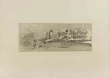 Love, Death and the Beyond is a original modern artwork realized by Max Klinger in 1881.The artwork belongs to a series of prints called Intermezzi realized by Max Klinger, published by Nurnberg: Stroefer, 1881.Etching on paper.Signed and dated on the plate.Plate n. XIIGood conditions except for some shadow and light folds on paper.Dedicated to the engraver and art dealer Hermann Sagert who had supported the publication of the young artist's works. Intermezzi by Max Klinger offers a wide assortment of entertainment, such as short comic interludes between scenes of an opera. The portfolio highlights the capriciousness of life and includes a sequence of four prints on the mythological lives of centaurs, four prints based on Hans Jakob Christoph von Grimmelshausen's 17th-century tale The Adventurous Simplicissimus, and four free compositions that further elaborate Klinger's favorite themes of desire, death and fantasy. The twelve etchings vary in size and format, but all reveal sublime panoramas and demonstrate Klinger's mastery of the vocabulary of romantic landscapes and the lessons learned from studying Japanese prints.