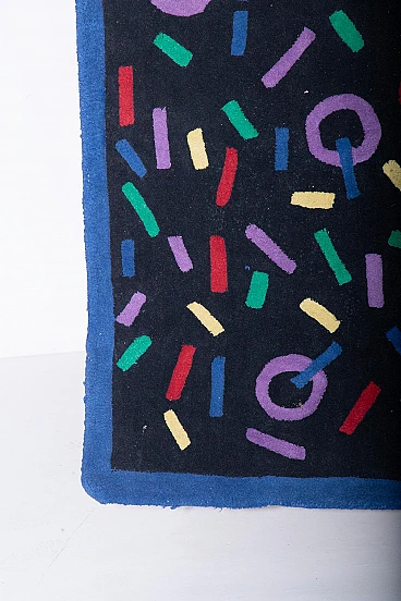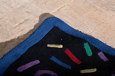 Step into the vibrant era of the 1970s and 80s with this exquisite vintage rug. This piece embodies the bold and innovative design aesthetics of its time, making it a standout addition to any home or collection. The rug features a striking pattern of colorful geometric shapes set against a deep, dark background. The playful arrangement of circles, lines, and rectangles in vibrant hues of red, green, yellow, purple, and blue captures the essence of retro design. This artistic expression not only adds visual interest but also creates a dynamic and lively atmosphere in any space. In original condition from the 1970s-80s, this rug showcases slight signs of wear that add to its vintage charm and authenticity. These minor imperfections are a testament to the rug's journey through time, enhancing its character and appeal. Its generous size makes it an excellent choice for larger rooms, where it can serve as a central decorative element that ties the space together. The 1970s and 80s were periods of significant cultural and artistic change, marked by experimentation and a break from traditional design norms. This rug is a perfect representation of that spirit, blending form and function in a way that challenges conventional aesthetics. Its bold design and vibrant colors reflect the optimism and forward-thinking mindset of the era. Owning a piece from the 1970s-80s not only adds a unique charm to your home but also connects you to a pivotal time in design history. The vibrant colors and geometric patterns make it versatile for various interior styles, from retro to contemporary. As a vintage piece in good condition, this rug is not just a home accessory but a collectible item that may increase in value over time. Imagine this rug as a statement piece anchoring your living room seating area, adding warmth and color, or placed under your bed or in front of a wardrobe for a touch of retro elegance. It can also enhance your workspace with a pop of nostalgic style, making it a more inspiring and creative environment. This vintage rug from the 1970s-80s is more than just a floor covering; it's a piece of art that tells a story. Its rich history, coupled with its striking design, makes it a must-have for any collector or enthusiast of retro decor. Don't miss the chance to own this extraordinary piece that brings the past into the present with timeless elegance. Add to your collection today and let this beautiful rug be the centerpiece of your decor.