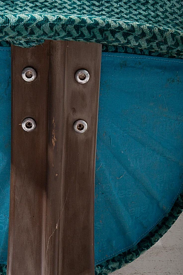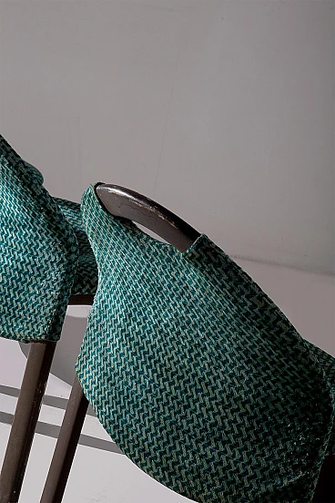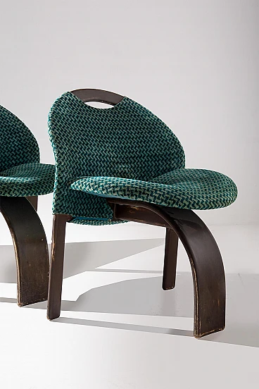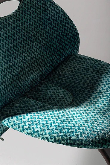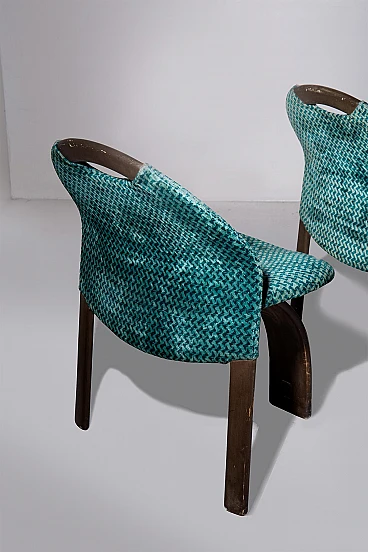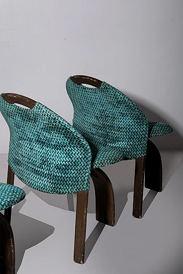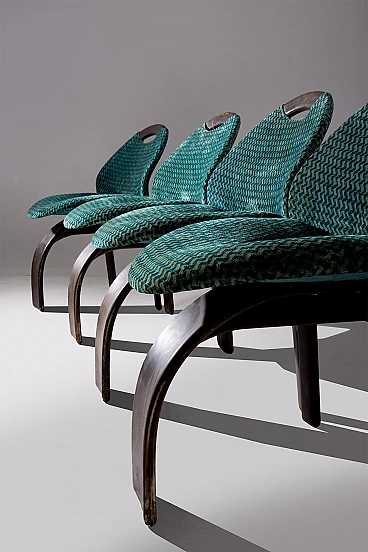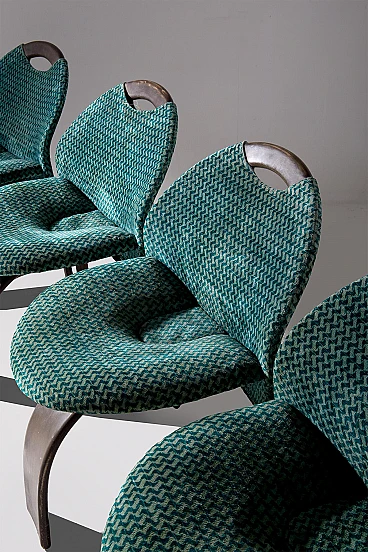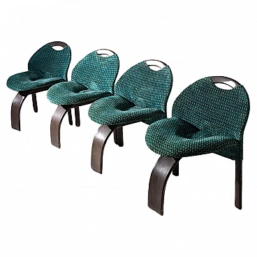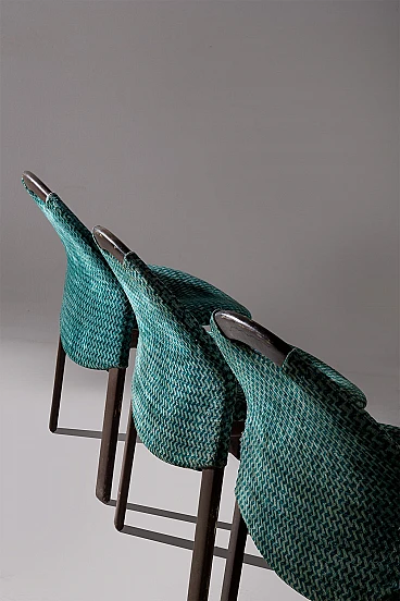 This stunning set of four 'Sail' chairs is a masterpiece of 1970s Italian design, created by the genius mind of Giovanni Offredi and produced by Saporiti in 1973. The 'Sail' chairs embody the elegance and modernity typical of that era, with a shape that almost seems to float in the air. The structure of the chairs is a harmonious combination of curved lines and high-quality materials. The smooth, luxurious green velvet upholstery adds a touch of sophistication and comfort, making these chairs a pleasure not only for the eyes but also for the body. The dark ABS legs provide a striking visual contrast while ensuring stability and durability. Each chair, with its ergonomic and enveloping design, invites you to sit and relax, offering a unique seating experience. Offredi's 'Sail' chairs are not just simple chairs but true works of art that enhance any space with their unmistakable and timeless style. These chairs represent a piece of Italian design history, an investment in elegance and functionality that will never go out of style. Giovanni Offredi, a legendary name in the design world, is known for his innovative approach and sophisticated taste.