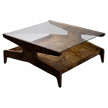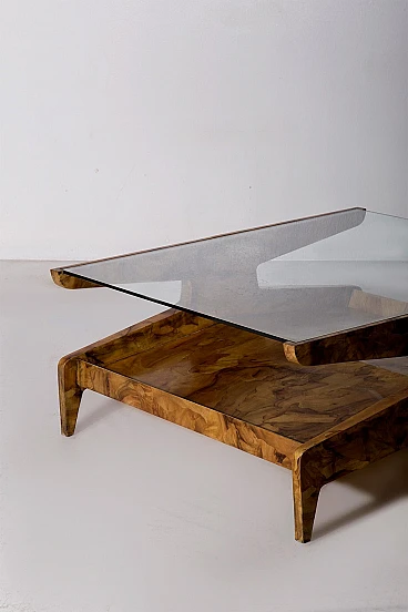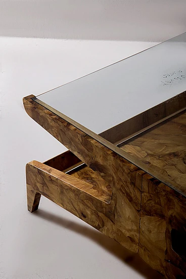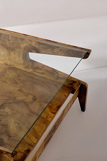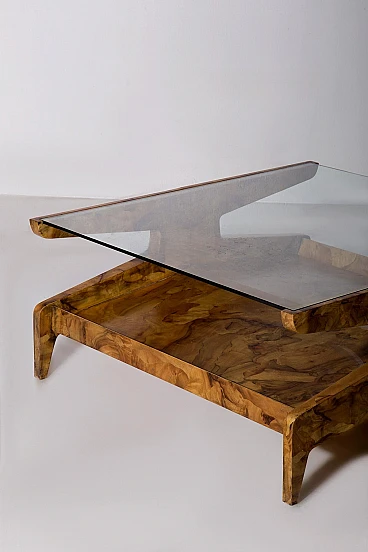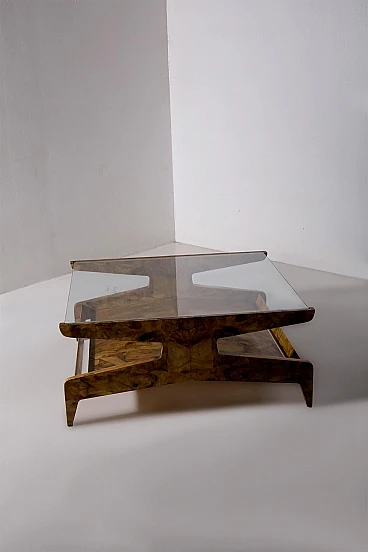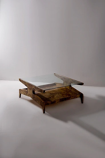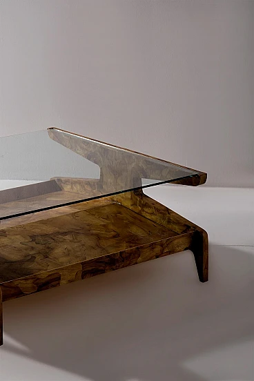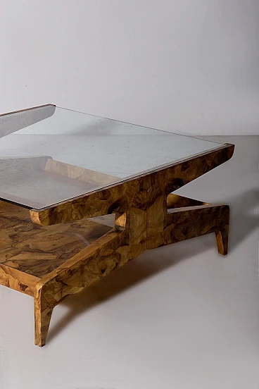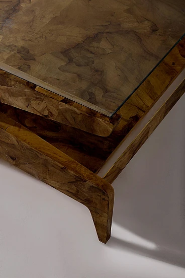 Crafted with artisanal mastery, the table features a structure made of fine wood, finished with an exquisite burl veneer, giving the piece a unique and distinctive character. The top surface is made of thick transparent glass, allowing one to appreciate the beauty of the wood underneath, creating an intriguing play of light and shadows.