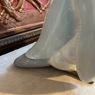 This figure showcases a realistic and expressive depiction of a penguin, capturing the bird's unique characteristics with precision. The porcelain is carefully painted to reflect the natural beauty of a penguin, with a sleek white body, gray belly, golden accents, and subtle shading to highlight the texture of the feathers. The figure stands in an upright pose, with its wings slightly spread and its head tilted, giving it a lifelike and endearing appearance. The craftsmanship of Ronzan is evident in the intricate details, from the delicate features of the penguin's face to the smooth finish of the porcelain. This figure would be a delightful addition to any collection of mid-century Italian ceramics or animal figurines, adding a touch of whimsy and elegance to any display. It's in perfect condition.