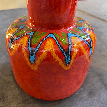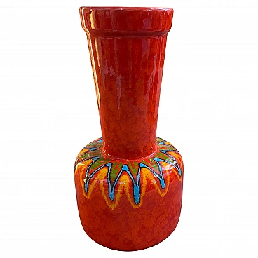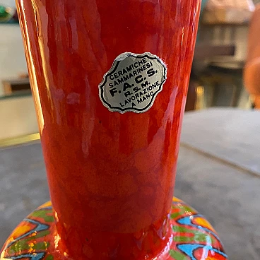 A red veraci vase designed and hand-crafted in San Marino in the Fifties, it's in perfect condition overall. It is a vibrant and eye-catching piece of ceramic art. Hand-painted in bold and vivid colors, the vase features a striking combination of red, yellow, and blue. The design is abstract, typical of mid-century modern aesthetics, which emphasizes clean lines and dynamic patterns. The vase's form is elegant yet simple, showcasing the era's preference for functional yet stylish decor. The craftsmanship of the vase reflects the high quality associated with San Marino ceramics, known for their meticulous attention to detail and artistic flair. The glaze finish gives the vase a glossy and smooth surface, enhancing the depth and richness of the colors. This vase is a stunning centerpiece or decorative item in any modern or retro-themed interior, adding a pop of color and a touch of mid-century charm.