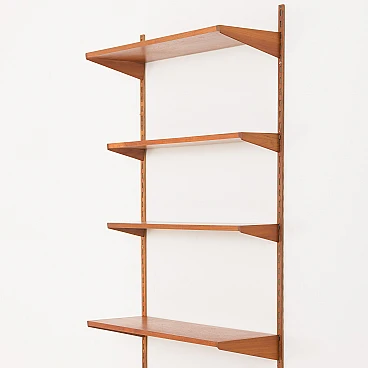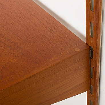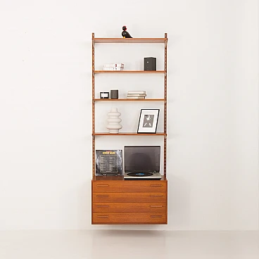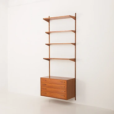 The section is 88.5 cm wide, and one can arrange all the parts at will, thanks to a very easy system of brackets.The dresser features four spacious drawers, perfect for storing various items. Each drawer is equipped with interesting elongated handles, which add a distinctive touch to the piece’s overall aesthetic. These handles are not only functional but also contribute to the dresser’s elegant design, making it a standout element within the shelving system. The rails are veneered in teak which is a rare and very elegant feature, seen only in few KK units. Dimensions: Overall: H: 229 cm / W: 88.5 cm / D: 42 cm; Dresser: H: 50 cm / W: 85.5 cm / D: 42 cm; Shelves: 2 x (28 cm x 85.5 cm) and 2 x (18 cm x 85.5 cm). Metal rails: 229 cm each.