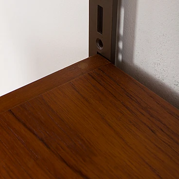 The shelving system is entirely modular and can be organized according to needs thanks to an easy system of metal supports that fit into the tracks, allowing the adjustment and interchangeability of all parts. Despite the passage of time, the wall unit is in excellent original condition. Small traces of use are typical of furniture from this era. The manufacturer's stamp on the back of the shelves confirms its authenticity and high quality. The wood has been cleaned and finished with layers of Danish oil to enhance its natural beauty.