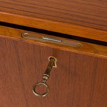 Crafted to be aesthetically pleasing and practical, this wall-mounted cabinet is crafted from warm-toned teak wood, with a beautiful wood grain pattern on both the inside and outside of the cabinets. The use of high quality teak wood and veneer ensures the durability and longevity of the piece. Attention to detail is evident in the sculpted side panels of the shelves and the precise joinery joints, which highlight the mastery of Danish craftsmanship. These elements, made of solid teak, also provide additional structural reinforcement.