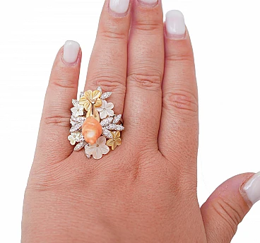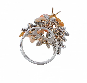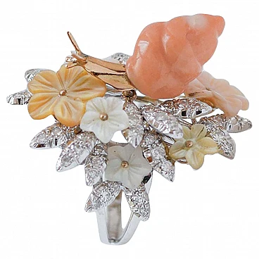 14 kt white gold ring with coral, multicoloured stones and diamonds