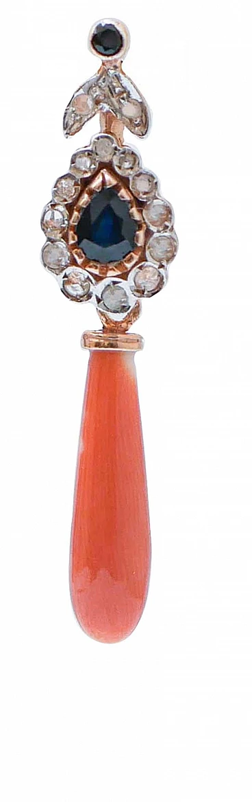 SHIPPING POLICY: No additional costs will be added to this order. Shipping costs will be totally covered by the seller (customs duties included). PS: THIS POLICY IS NOT APPLICABLE TO ITEMS WITH FIX PRICE, ITEMS AT AUCTIONS ,ONGOING PROMOTIONS AND ITEMS ON SALES. Fantastic earrings in 9 kt rose gold and silver structure mounted with sapphires and diamonds n the upper part. As pendant, a drop coral. These earrings were totally handmade by Italian master goldsmiths and they are in perfect conditions. Diamonds 0.25 ct Sapphires 0.98 ct Coral 1.60 gr Total Weight 5.20 gr RF *GGGI For any informations, feel free to contact the seller through the message center.