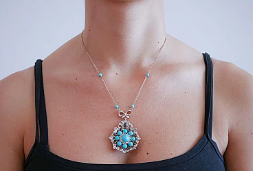SHIPPING POLICY: No additional costs will be added to this order. Shipping costs will be totally covered by the seller (customs duties included). PS: THIS POLICY IS NOT APPLICABLE TO ITEMS WITH FIX PRICE, ITEMS AT AUCTIONS ,ONGOING PROMOTIONS AND ITEMS ON SALES. Retrò pendant necklace in 9 kt rose gold and silver structure mounted with a central magnesite surrounded by a frame of turquoises, diamonds and sapphires. Along the chain, four turquoises. This pendant necklace was totally handmade by Italian master goldsmiths and it is in perfect conditions. Diamonds 1.00 ct Sapphires 1.85 ct Turquoise 1.80 gr Magnesite 1.00 gr Total Weight 19 gr RF *UUUI Height Pendant 5.9 cm ( knot included) Lenght Chain 45 cm For any informations, feel free to contact the seller through the message center.