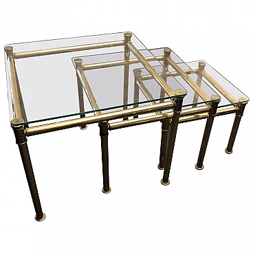 Three brass and glass nesting tables in the manner of Tommaso Barbi, made in Italy in the 1960s. Good conditions overall.