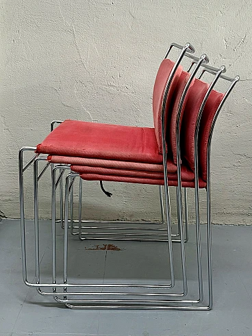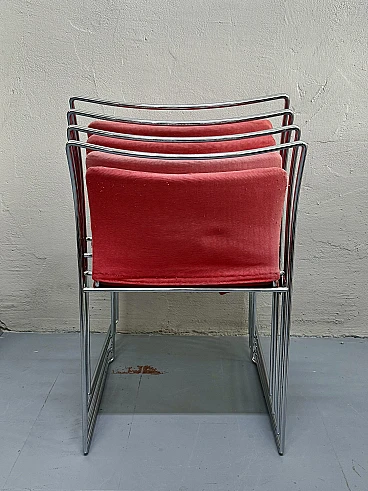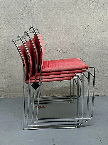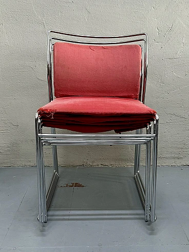 Four stackable chairs with chrome-plated metal frame and fabric seat (to be reupholstered). Designed by Japanese architect Takahama. Suitable for any environment.