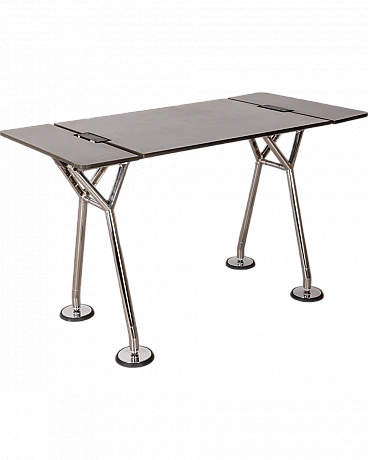 Table with chromed steel structure and black laminated wooden top, Nomos model. Design Norman Foster for Tecno, 1980s.