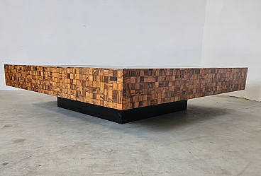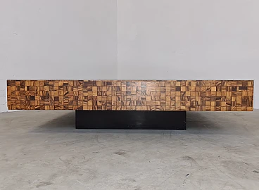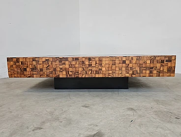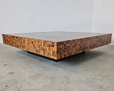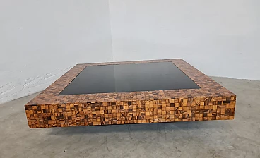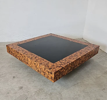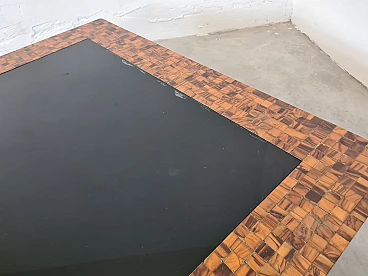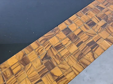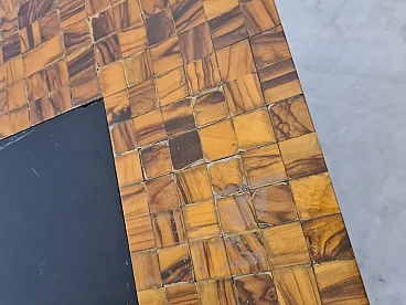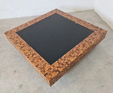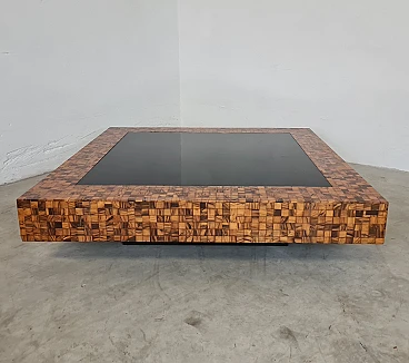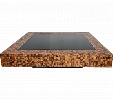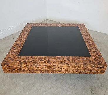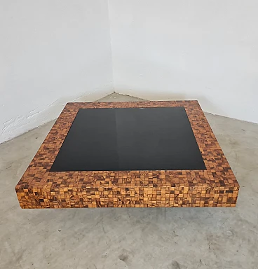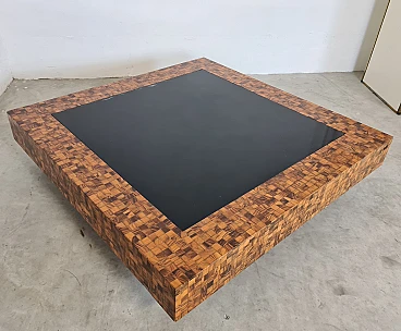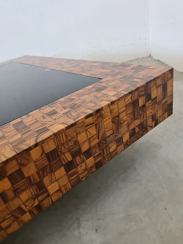 Rare and elegant living room table decorated with olive wood and black glass mosaic. Designed by Roman architect and designer Sandro Petti, who contributed to the creation of the "good life" on the island of Ischia where he lived and where he designed and opened numerous venues. With its refinement this large table is ideal for furnishing your rooms and giving a touch of charm.