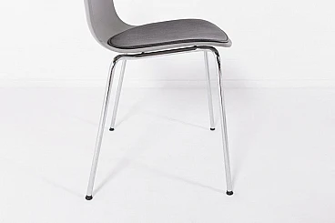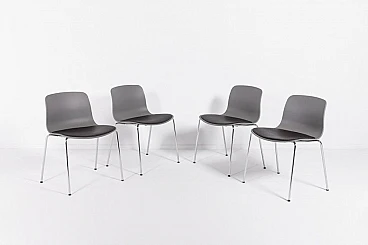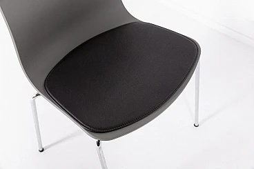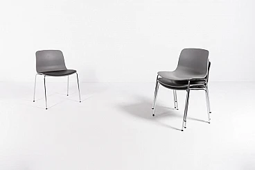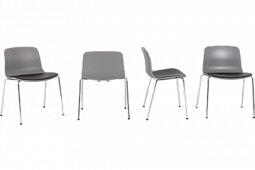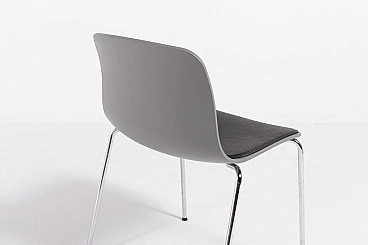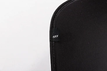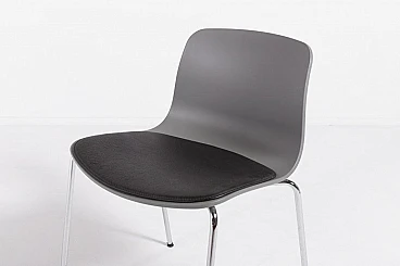 The series was designed by Hee Welling for HAY. Its functional shape and the aesthetic design wonderfully go hand in hand. The idea behind the chair is boldly reduced, clear shapes in combination with high-quality materials. This makes it very easy to combine it with other furniture. It works well with a dining table, but also with a conference table or even in your home office. The chairs are equipped with a seat made of gray plastic and a tubular chromed steel frame. The seat offers loose black leather pad, stackable. Condition good, showroom pieces with small usage marks.