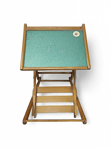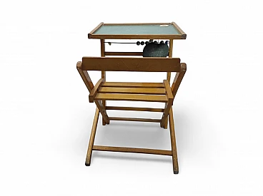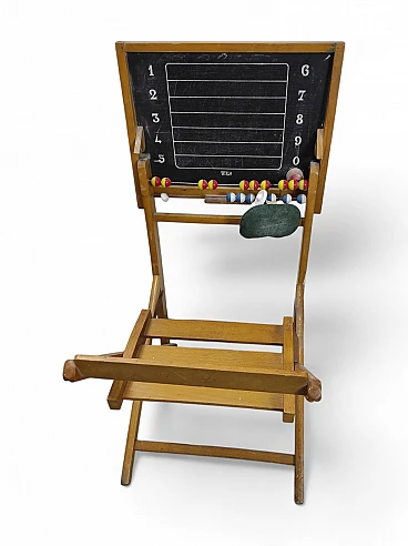 Vintage children's school desk. Equipped with movable top and folding blackboard. Measurements 67 x 48 x 74 cm (H x W x D), seat height 38 cm. Very good condition, the vintage item has no defects but may show slight traces of wear due to time.