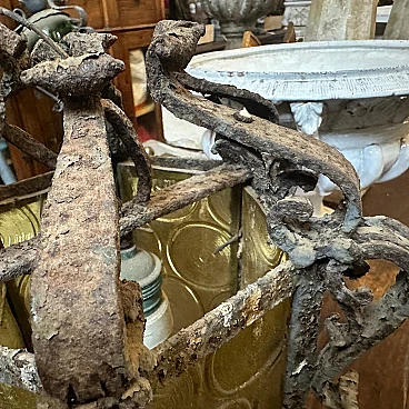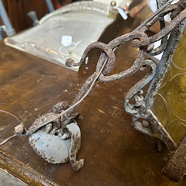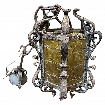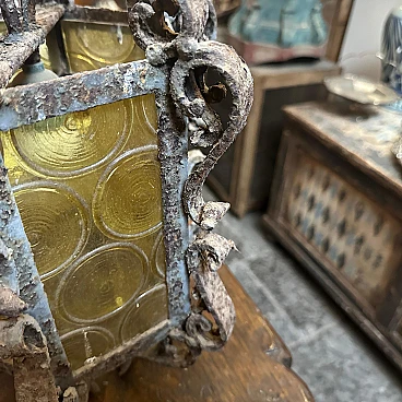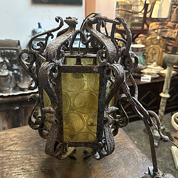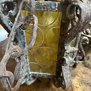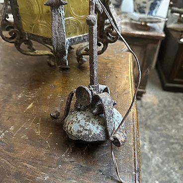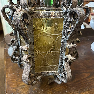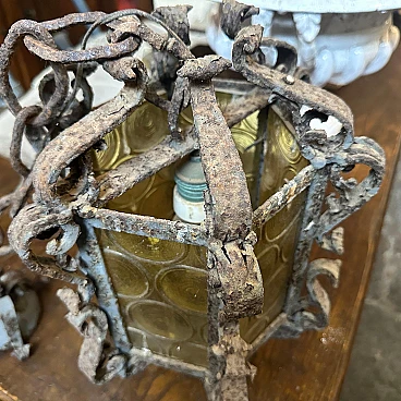 This 1960s Brutalist Italian pendant light has been made of iron and yellow glass. The design is robust and striking, featuring a heavy, hand-forged iron frame that exudes a sense of ruggedness and strength typical of the Brutalist style. The ironwork is intricate, with twisting and curling elements that create a cage-like structure around the glass panels, giving the piece an almost gothic appearance. The glass panels are a warm, amber-yellow color with a textured surface, likely designed to diffuse light in a soft, inviting manner. The combination of the warm glass and the cold, rough iron creates a contrast that is both dramatic and visually compelling. This pendant light has been intended to be a statement piece, providing not just illumination but also a strong decorative element in a space, reflecting the mid-century Brutalist movement's emphasis on raw materials and craftsmanship. Overall, this pendant is a fine example of mid-century Italian lighting design, combining functional artistry with the era's characteristic bold, industrial aesthetic. Two set of two pendants are available, bought fro a sea side villa, where the salt of the sea gives them an incredible patina, they are in working order and in original condition