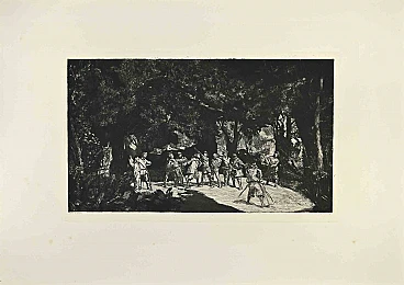 Opus IV Unter den Soldaten Rad belongs to a series of prints called Intermezzi realized by Max Klinger, published by Nurnberg: Stroefer, 1881.Etching on paper.Signed on the plateGood conditions.Dedicated to the engraver and art dealer Hermann Sagert who had supported the publication of the young artist's works. Intermezzi by Max Klinger offers a wide assortment of entertainment, such as short comic interludes between scenes of an opera. The portfolio highlights the capriciousness of life and includes a sequence of four prints on the mythological lives of centaurs, four prints based on Hans Jakob Christoph von Grimmelshausen's 17th-century tale The Adventurous Simplicissimus, and four free compositions that further elaborate Klinger's favorite themes of desire, death and fantasy. The twelve etchings vary in size and format, but all reveal sublime panoramas and demonstrate Klinger's mastery of the vocabulary of romantic landscapes and the lessons learned from studying Japanese prints.