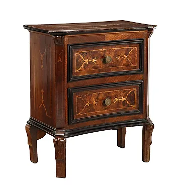 Baroque bedside table in walnut and poplar, maple fillets and inlays, 2 front drawers, ebonized moldings. Knobs replaced and restorations. Lombardy, mid-18th century.