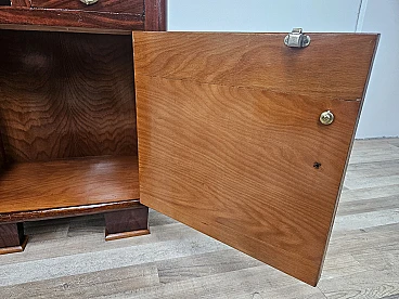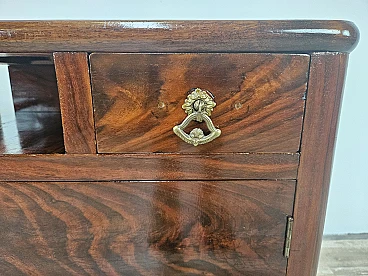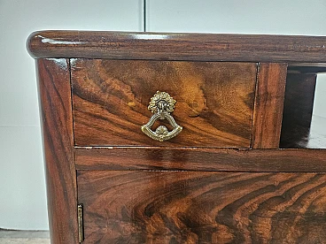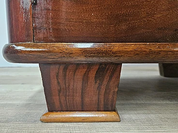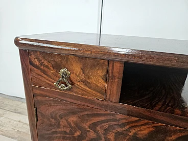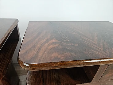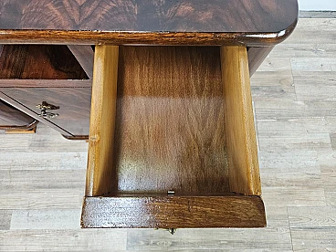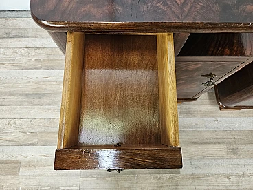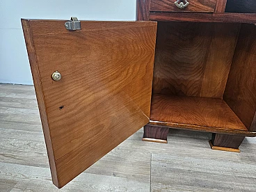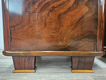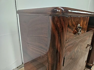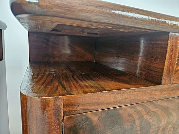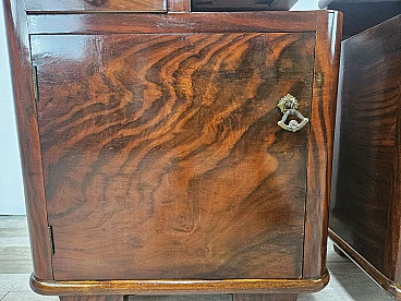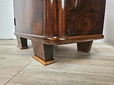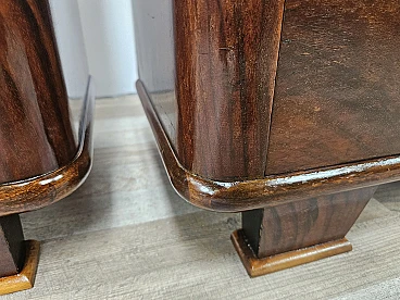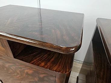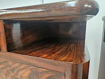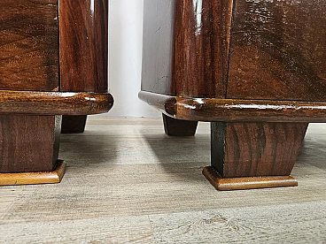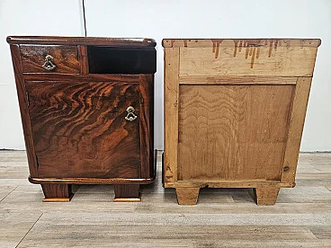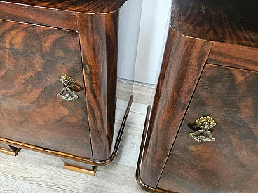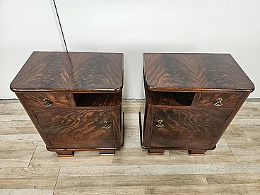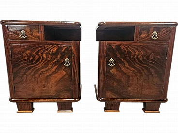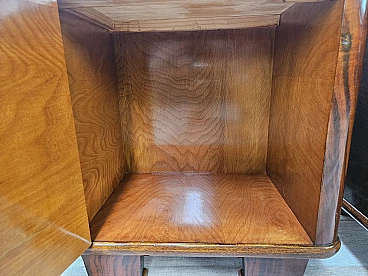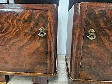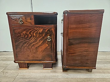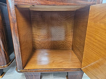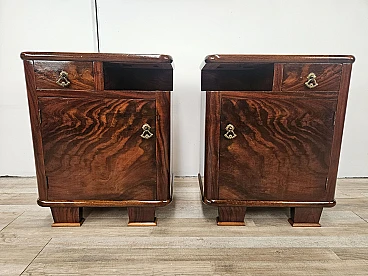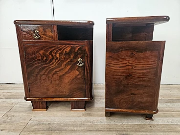 Particular and elegant Art Decò bedside tables in briar with maple details, with a very fine line and modern design. Brass knobs on door and drawer. Synergy between modern and antique style, these bedside tables can be combined with any type of room and furniture. The Art Decò bedside tables have been polished with oil and shellac, they show normal signs of wear due to age and use.