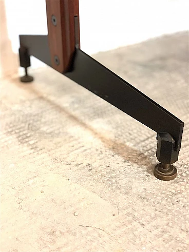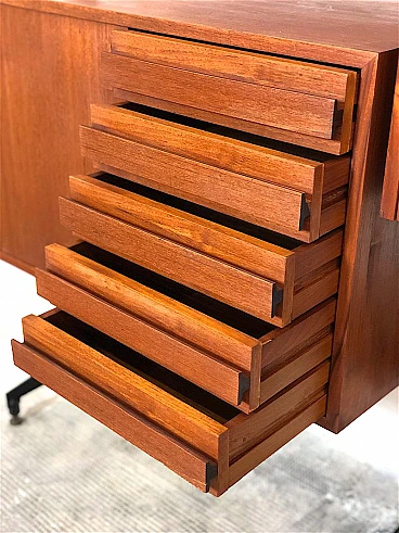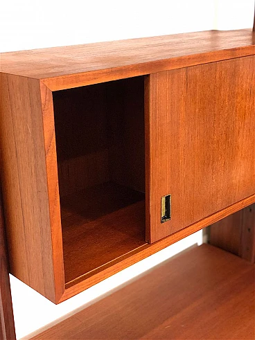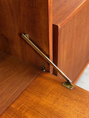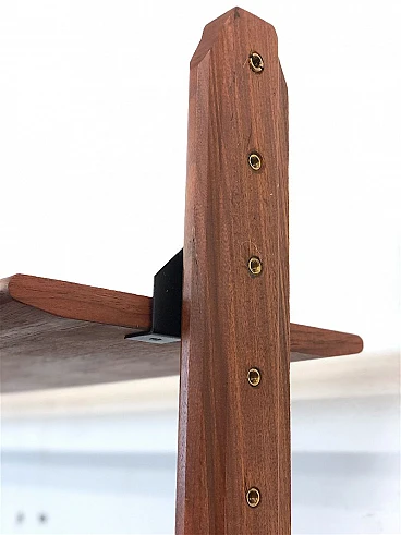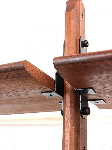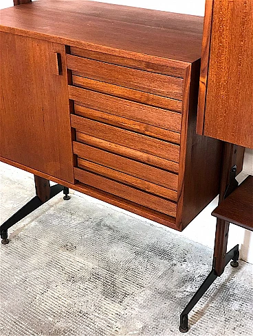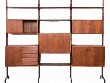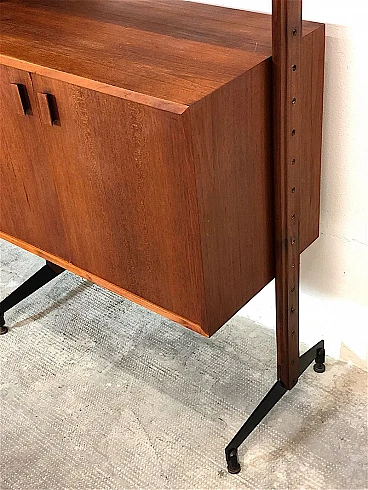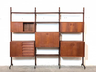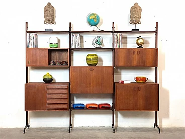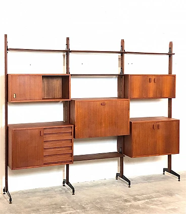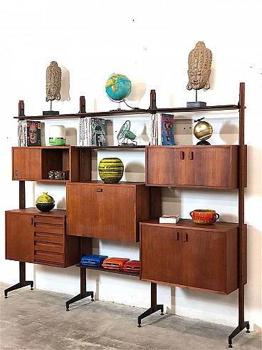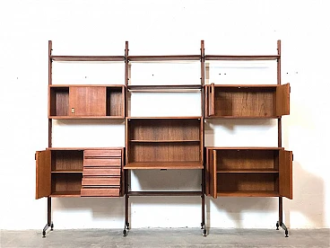 3-bay modular bookcase, 1960s. Made in Italy. The bookcase is made entirely of solid teak wood, of Italian manufacture. The bookcase is double-sided and can be used as a room divider as it is also finished on the back. Completely made of solid teak wood, composed of 4 uprights with adjustable brass feet, 5 shelves, 1 module with 5 drawers and opening door with internal shelf, 1 module with 2 opening doors and internal shelf, 1 module with sliding doors, 1 module with 2 opening doors, 1 module with flap door and internal shelf, shaped teak wooden handles, all elements are adjustable as desired. Completely washed and sanitized.