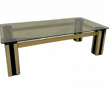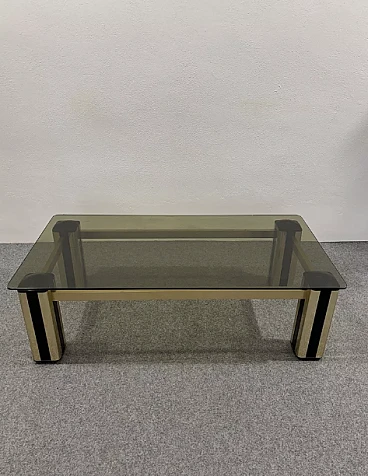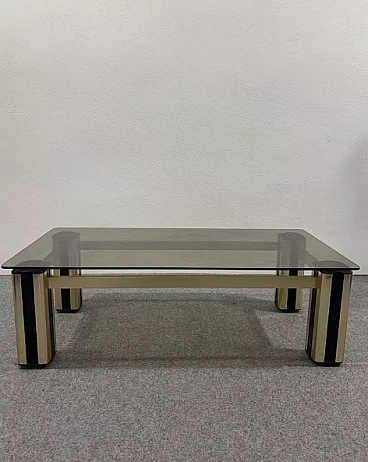 Coffee table in golden metal and plastic material, ocher glass top, produced in the 70s, Italian manufacturing. The item is in good conservative condition, there are no major aesthetic or structural defects to report, only slight and obvious signs of aging due to use and age.