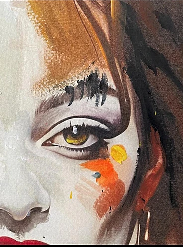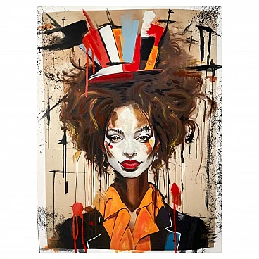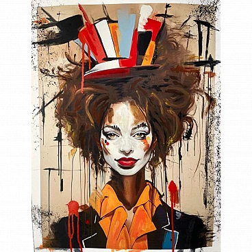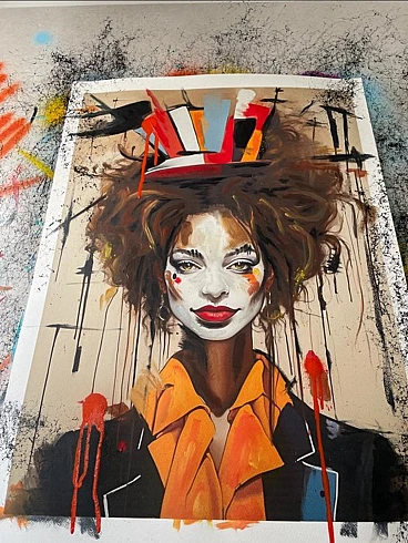 The acrylic on paper by Noir titled "Daisy the Wisdom Clown" presents a striking and whimsical portrait with a mix of surrealism and expressionism. The artwork features a female clown as the central figure, portrayed with an intricate and vibrant aesthetic. The clown named Daisy, is the main focus. Her face is painted white with dramatic makeup, including bold red lips and exaggerated black eyeliner. Her eyes are expressive, conveying a sense of depth and wisdom. Hat and Hair: Daisy wears a tall, multi-colored hat that is abstract and geometric in design. The hat is composed of sharp, irregular shapes in colors like red, orange, black, white, and blue, giving it a somewhat chaotic yet balanced appearance. Her hair is wild, curly, and voluminous, with dark tones, adding to the character's eccentric and lively persona. Daisy is dressed in what appears to be a formal outfit, featuring a large, orange bow around her neck. Her jacket is black with colorful accents that complement the colors of her hat. The sharp, angular design of the clothing contrasts with the more fluid and wild nature of her hair and hat. The background is abstract, featuring drips and splatters of paint, mostly in black and red. This gives the piece a dynamic and somewhat chaotic energy, further emphasizing the surreal quality of the character. The edges of the paper are also marked with similar splatters, creating a border that frames Daisy in this creative environment. Overall, the piece exudes a mix of playfulness and intensity, with Daisy portrayed as a figure of wisdom hidden beneath her clownish exterior. The use of bold colors, dynamic shapes, and expressive brushstrokes contribute to the artwork's captivating and slightly mysterious aura. Noir is a contemporary artist of Portugal Introducing an exceptional interpretation of this Noir's piece, this is a mixed media artwork titled "Daisy the Wisdom clown" This exclusive edition highlights the artist's passion In every stroke, Noir's work reflects her unwavering commitment to the art form Noir, a passionate artist, discovered her deep-seated love for Urban art and Illustration from a tender age. Over the years, Noir's artistic journey has unfurled, expanding the skills into various creative realms, including concept art and digital painting. With an unbridled fervor for the diverse world of art, and armed with a background in visual arts and fashion. In every stroke and pixel, Noir's work reflects an unwavering commitment to the art form. Noir persistently pushes the boundaries of the creativity. Exploring Noir's portfolio is an invitation to enter a realm where imagination knows no bounds - a place where each artistic stroke and pixel narrates a story, waiting for you to embark on the journey of discovery.