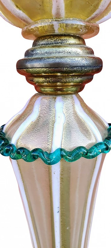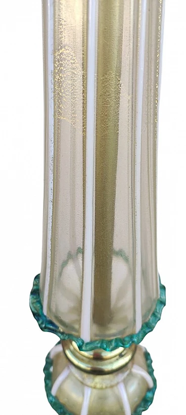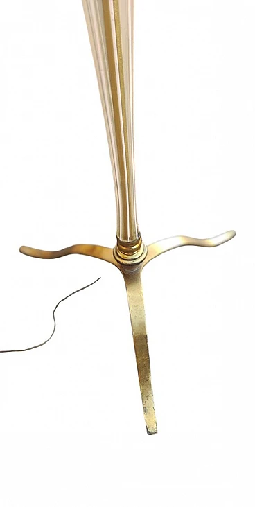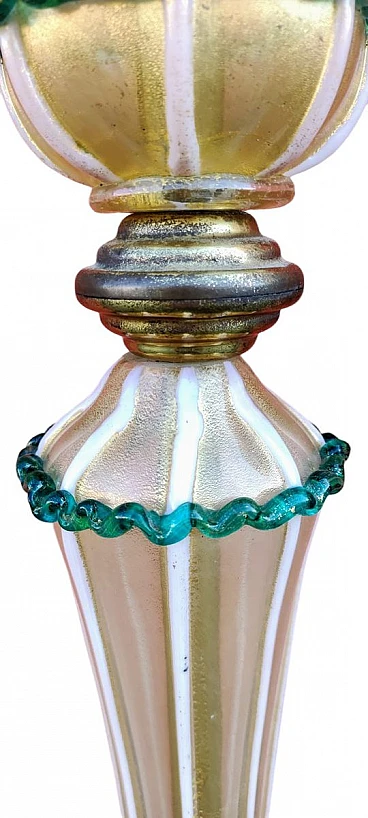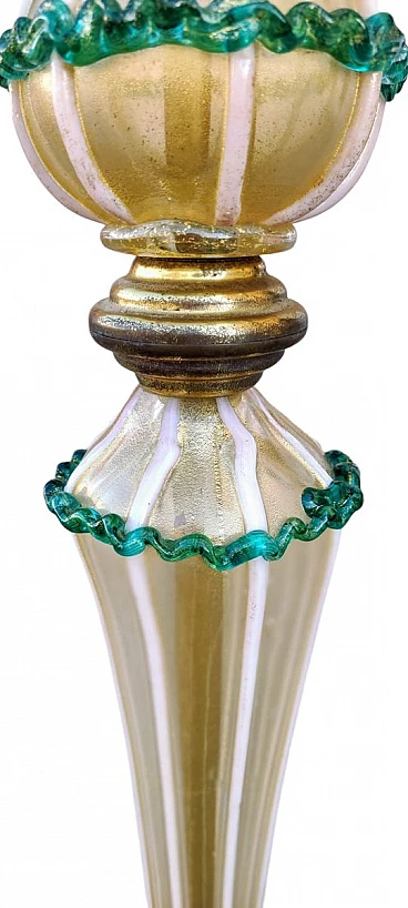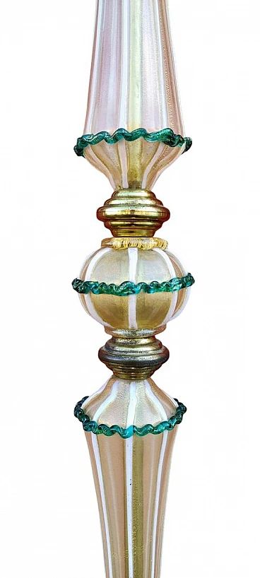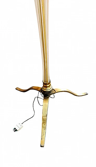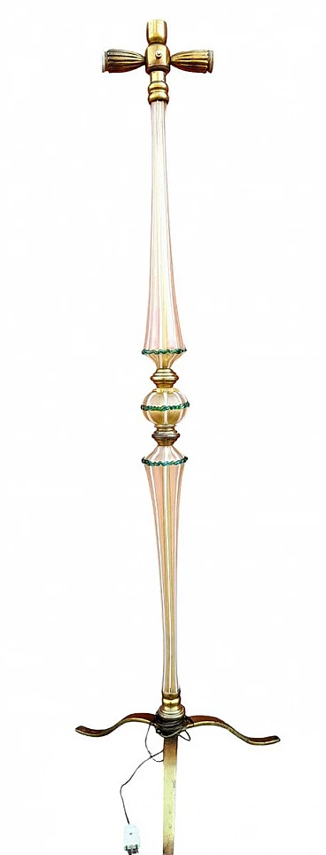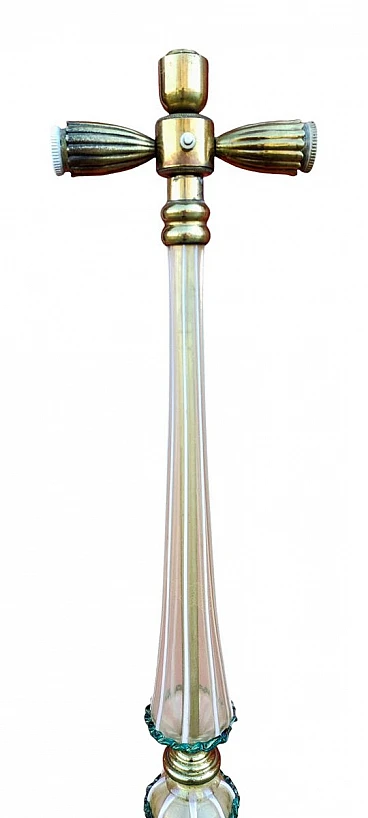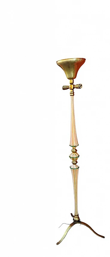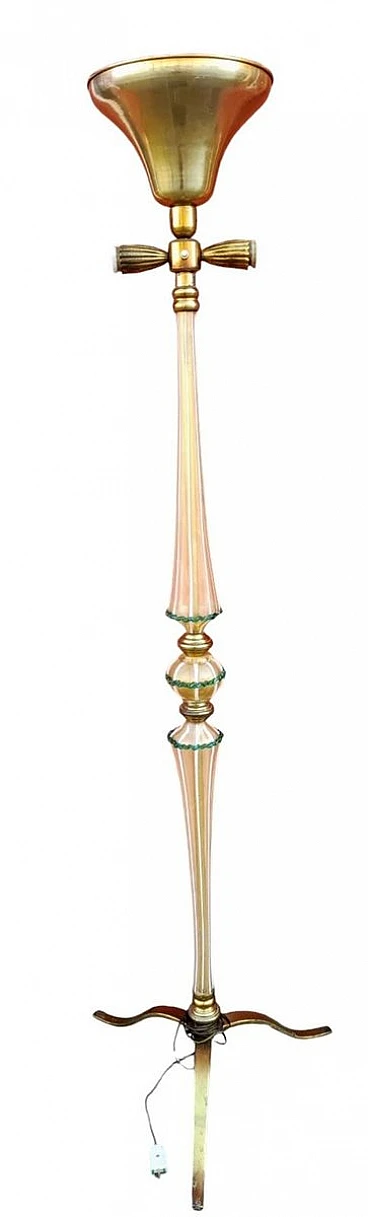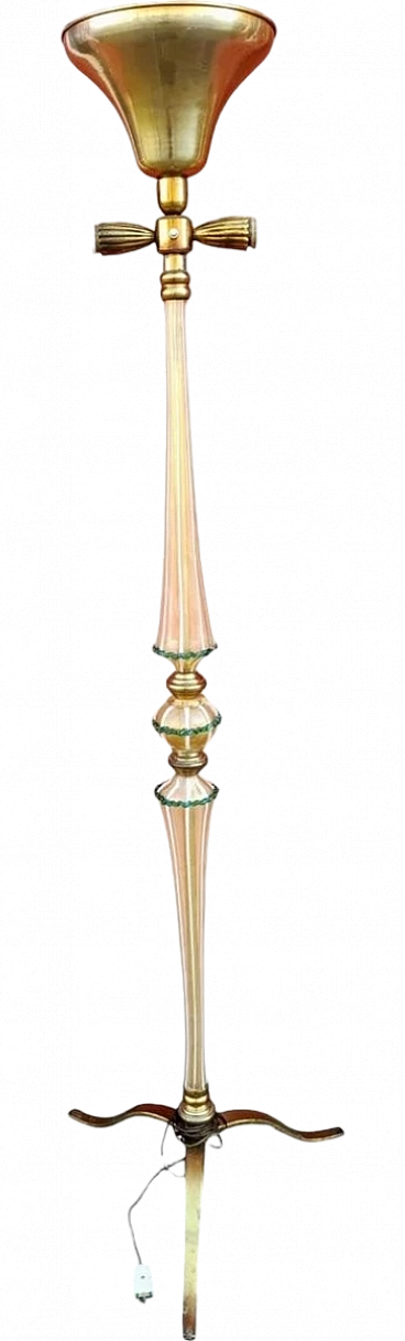 Elegant floor lamp by Barovier & Toso, 1936 in gilded Murano glass with green borders. Main structure and three-legged stand in brass plated iron. European plug and outlets for 2 light bulbs.