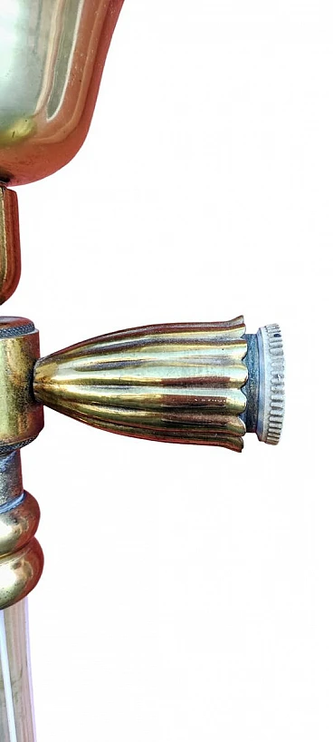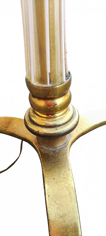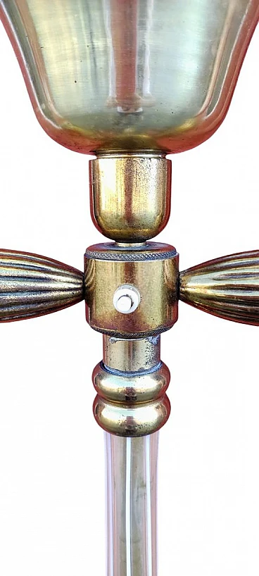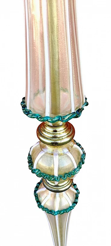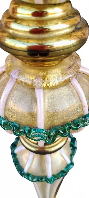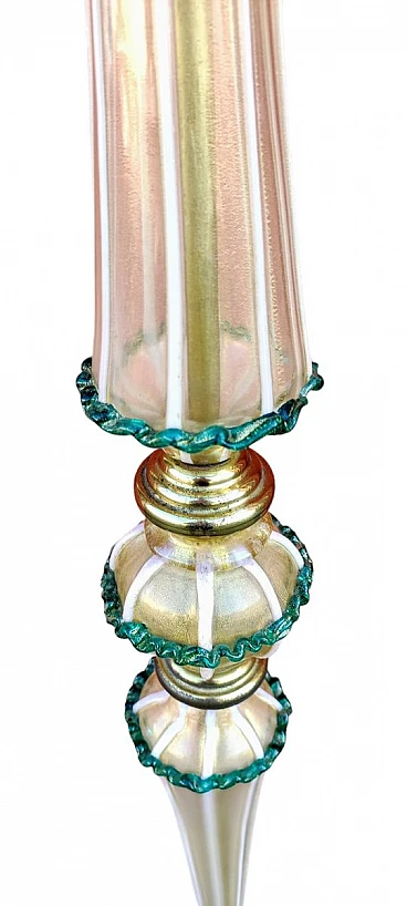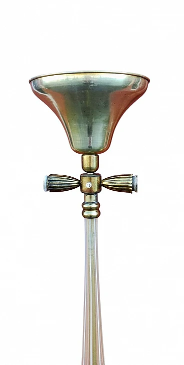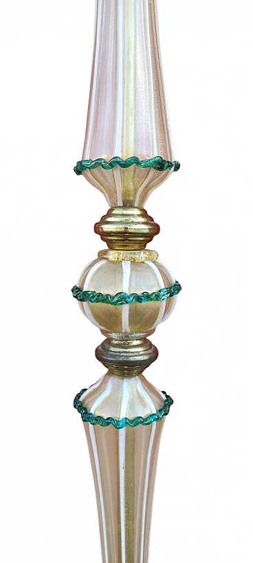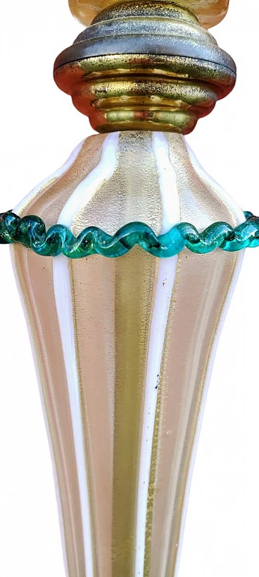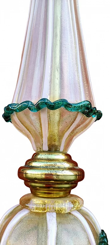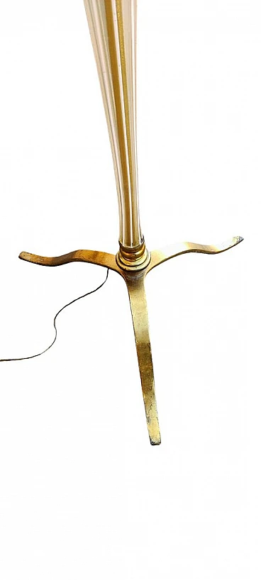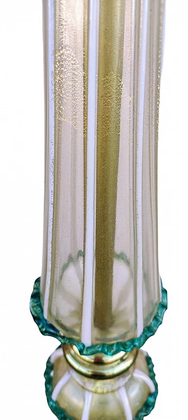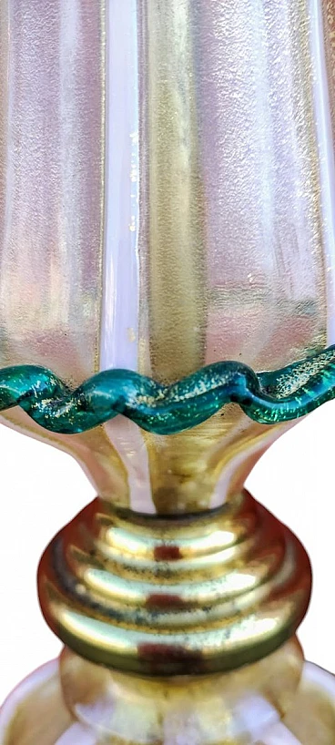 Elegant floor lamp by Barovier & Toso, 1936 in gilded Murano glass with green borders. Main structure and three-legged stand in brass plated iron. European plug and outlets for 2 light bulbs.
