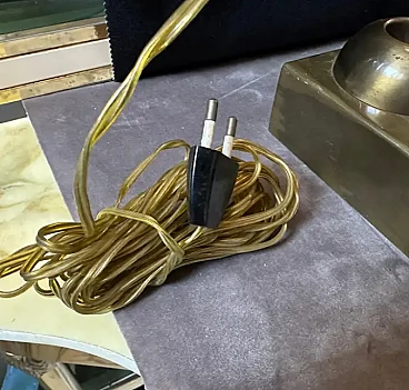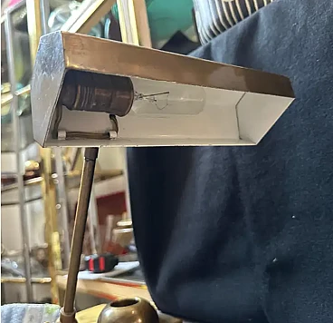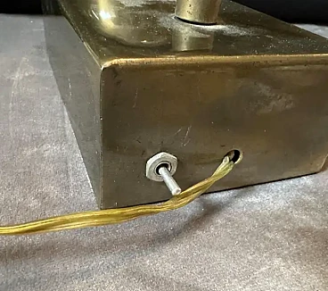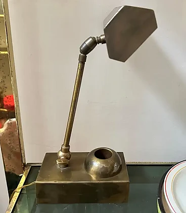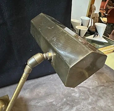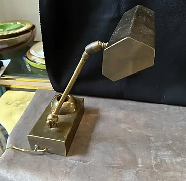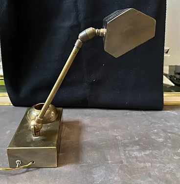 This lamp is representative of 1950s Mid-Century Modern Italian design, blending clean, functional lines with high-end materials like brass. The geometric design, especially in the lamp head, hints at the post-war embrace of industrial materials and forms, typical of the era's modernist influence. Italian mid-century lighting often married elegance with practicality, and this lamp is no exception, balancing artistic design with everyday usability. This desk lamp complements a modern or industrial office space or serve as a decorative lighting piece in a home. Its solid brass construction and unique geometric shape make it a statement piece that reflects the forward-thinking design sensibilities of 1950s Italy. It's in working order and in original patina.