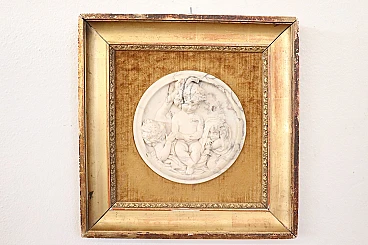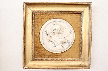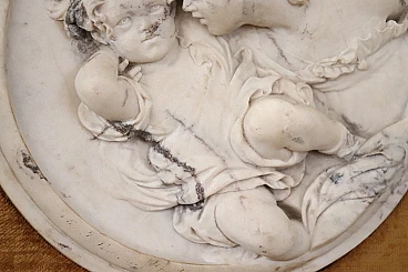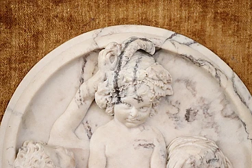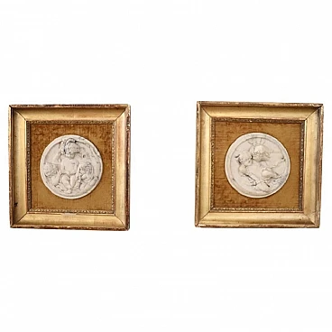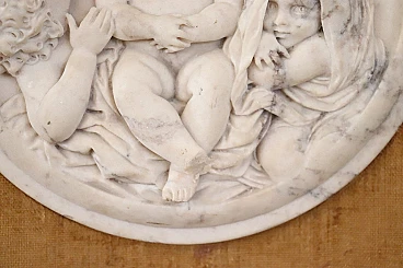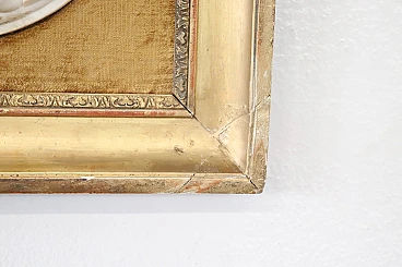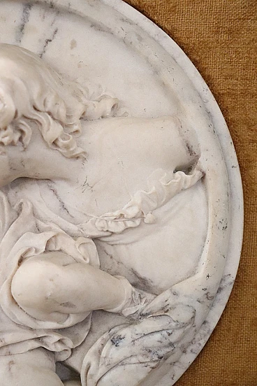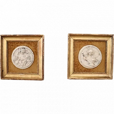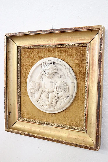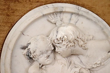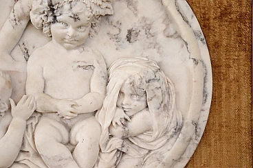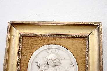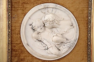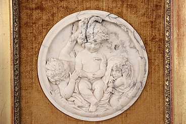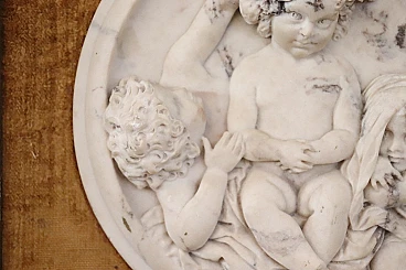 These sculptures represent an elegant testimony of 19th century art, with their delicate classical style and executive refinement. The two bas-reliefs show scenes of play between children, a recurring theme that expresses vitality and light-heartedness. The choice of white marble gives purity and brightness to the works, while the contrast with the ocher velvet and the golden frames enriches their aesthetic appeal. Despite the lack of a child's foot in one of the bas-reliefs (see photo details), the whole maintains a notable artistic value, enhanced by the care taken in the design of the frames which harmoniously complete the presentation. These elements make the two sculptural bas-reliefs perfectly adaptable to various environments, adding a touch of timeless nobility and grace.