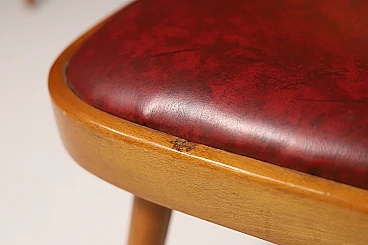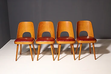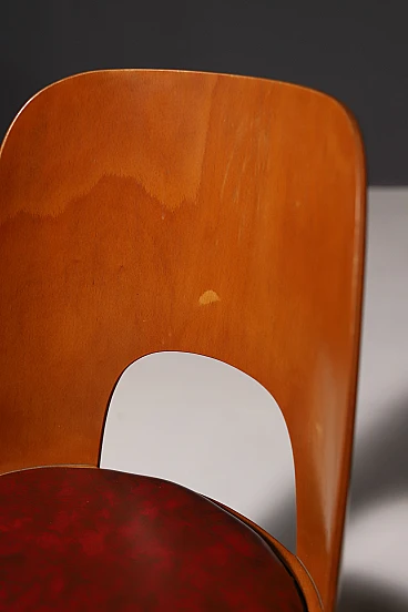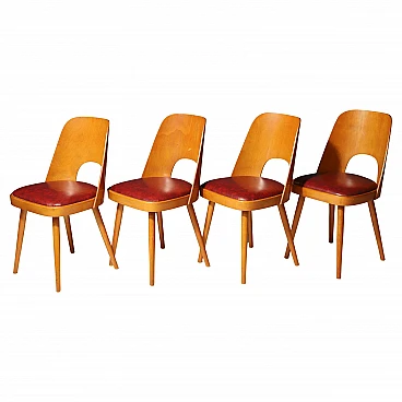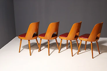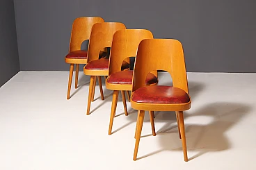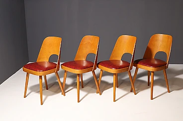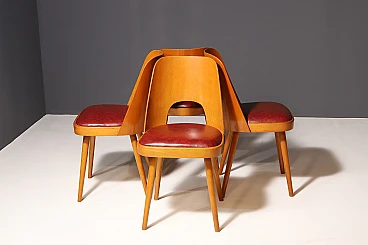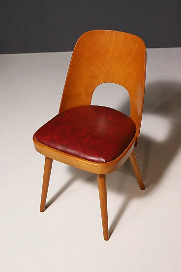 An interesting model of mid century bentwood dining chairs. Designed by Radomír Hofman for TON Bystřice pod Hostýnem (Thonet successor in Czechoslovakia after World War 2) . They were made in the former Czechoslovakia in the 1960´s. The chairs are made of bent plywood, have beech wood structure and are upholstered with burgundy leatherette.