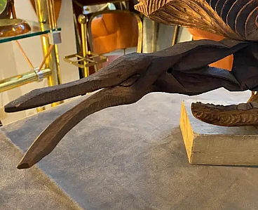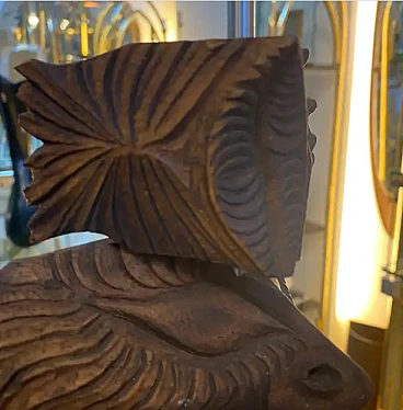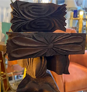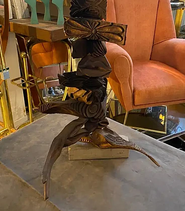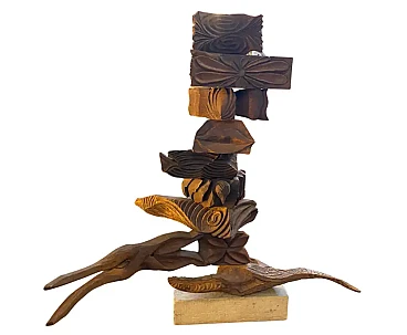 This sculpture is a contemporary, hand-carved wooden artwork from the 2000s. It features a series of intricately shaped wood blocks and organic forms stacked in a vertical arrangement. The unique design includes geometric and natural elements, giving it a dynamic and abstract appearance. The wood pieces vary in shape and texture, with some resembling folded fabric patterns and others featuring linear carvings, adding depth and contrast. The sculpture has a movable, allowing for slight adjustments in the positioning of the individual elements. It stands on a sturdy rectangular base, which grounds the entire structure. This combination of geometric shapes and natural motifs reflects a modern aesthetic, making it a compelling piece for a contemporary setting.