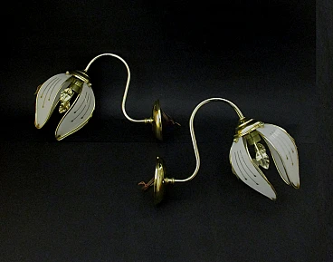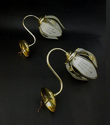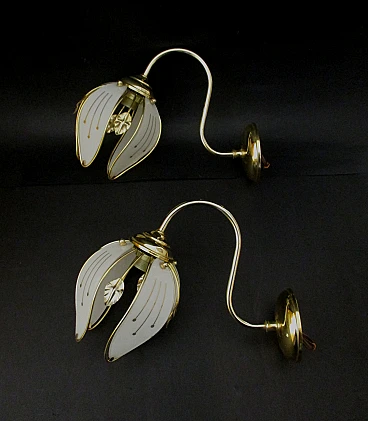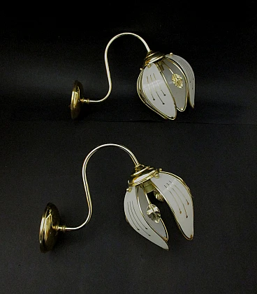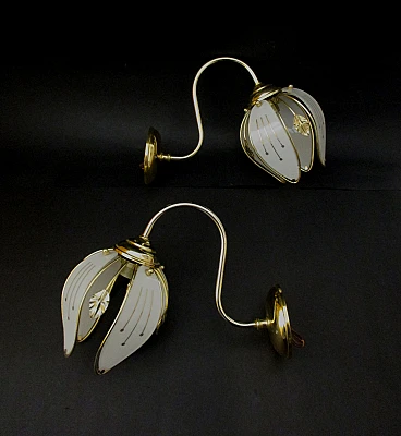 Wonderful first pair of wall lamps from the 1960s made of brass with glass leaf lampshades embellished with splendid decorations in pure gold, fitted with E14 lamp holders, very beautiful and of notable scenographic impact thanks also to the details created with accuracy and refinement, ideal as an object of furniture, any lighter areas are due to the reflection of artificial light, excellent condition as shown in the photos. Dimensions for each wall light: height cm. 22 - width cm. 15 - length cm. 30