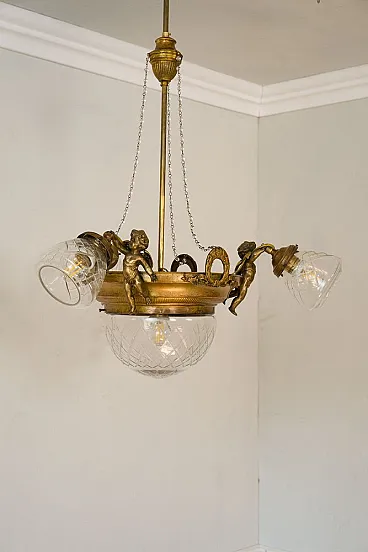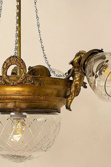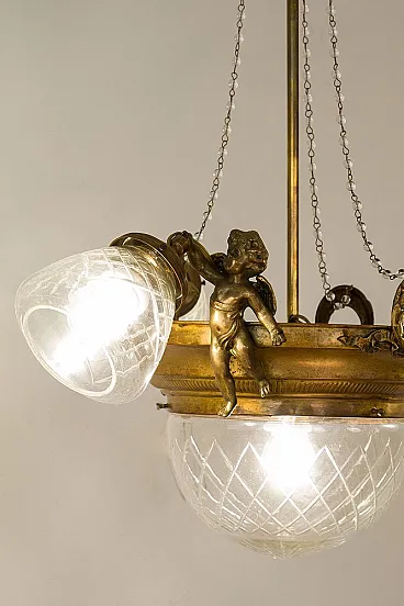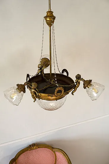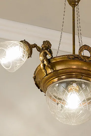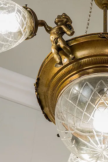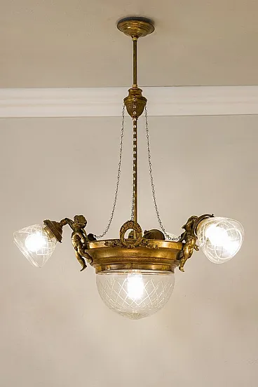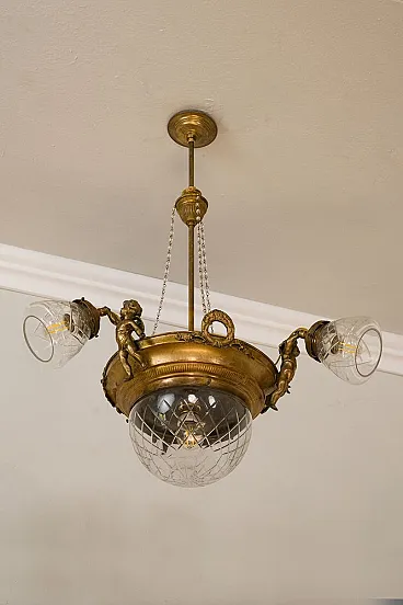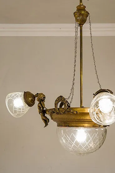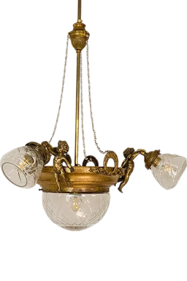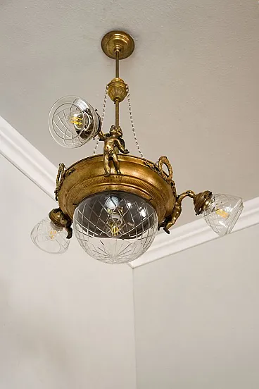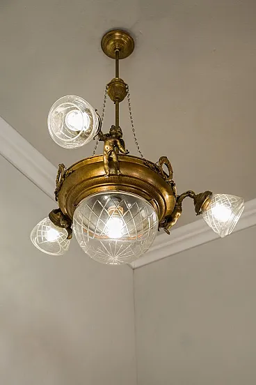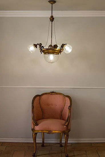 Refined Art Nouveau style chandelier, made in Italy in the early 1900s. The brass structure is adorned with three pages that delicately support the lampshades, while in the center a glass globe engraved with geometric patterns creates a fascinating play of light. The ivy-shaped details, emblematic of the Art Nouveau style, add a touch of timeless elegance. Equipped with four lamp holders with E27 socket, it is also compatible with E26 bulbs for the US market and supports dimmable systems for personalized light adjustment.