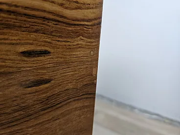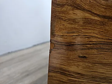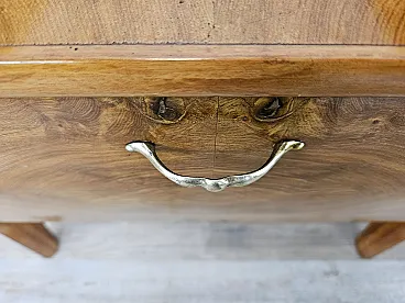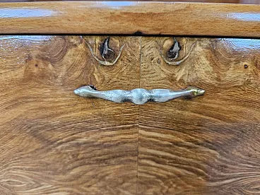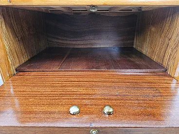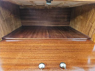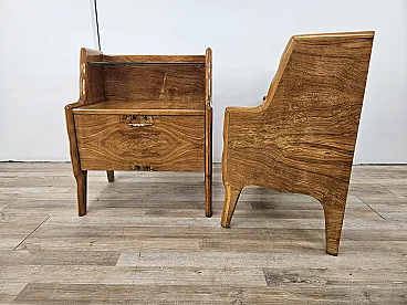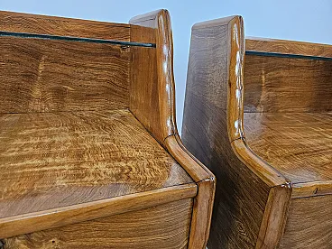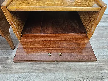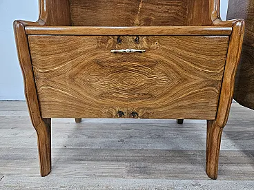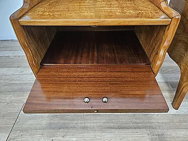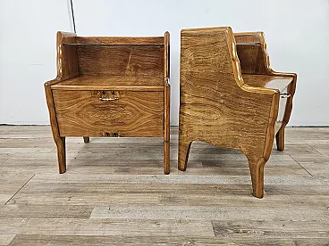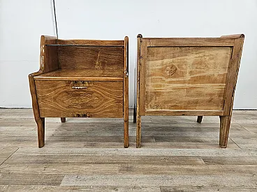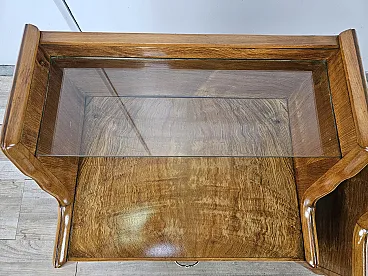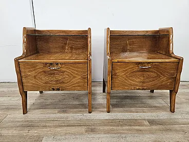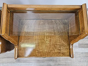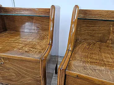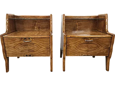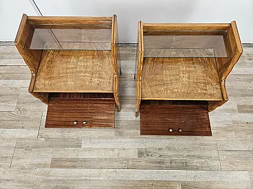 Pair of vintage 1960s bedside tables of Italian production, entirely made of wood covered in briarwood with a transparent glass shelf. The door with flap opening is unique and is enriched by brass handles. They have been polished, they show normal signs of age and use.