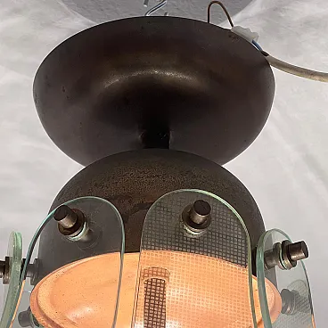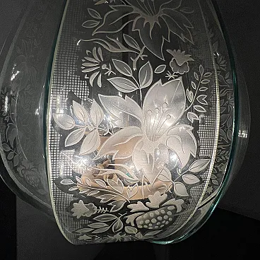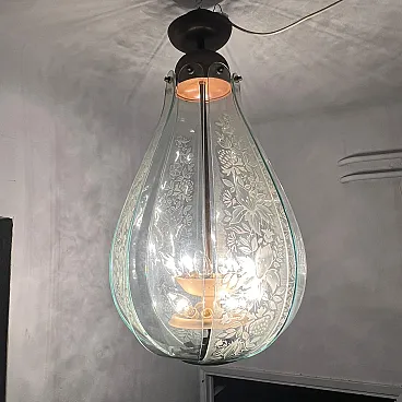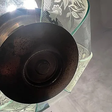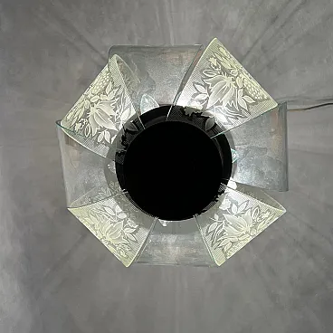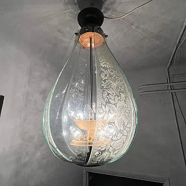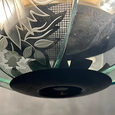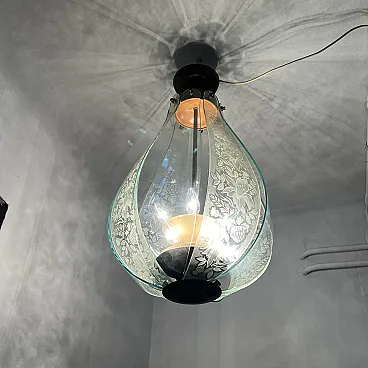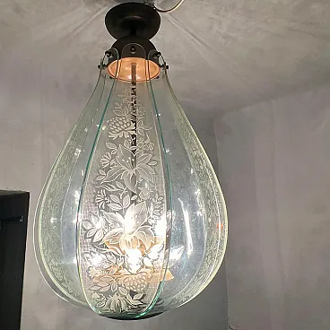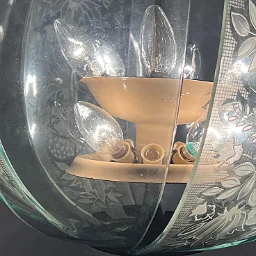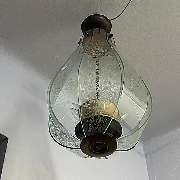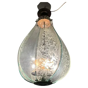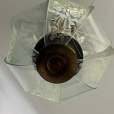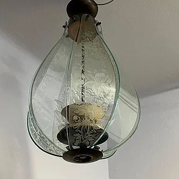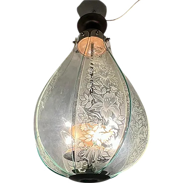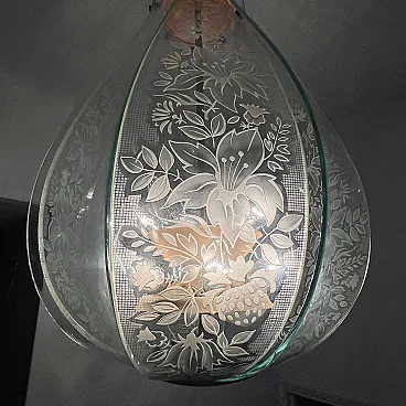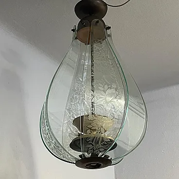 The chandelier in the photo is a fine example of Pietro Chiesa's design for Fontana Arte in the 1940s, a work that embodies the author's distinctive and classic aesthetic. The structure consists of eight lozenges of curved glass, with an elegant alternation of panels: four are decorated with floral patterns made by etching, while the remaining four are left plain, creating a play of light and transparency that emphasizes the complexity of the form. The decorations on the etched glass show an interweaving of leaves and flowers, an ornamental motif reminiscent of traditional craftsmanship but at the same time easily traceable to Pietro Chiesa's unmistakable style. This engraving technique adds depth to the design, making it precious and giving it a timeless appeal. Each pane of glass is numbered with a small engraving made by grinding wheel, a detail that testifies to the care for precision and craftsmanship with which this piece was produced. It is a rare chandelier that is particularly sought after by collectors precisely because all elements are original and coeval, keeping the historical and artistic integrity of the design intact.