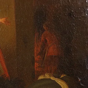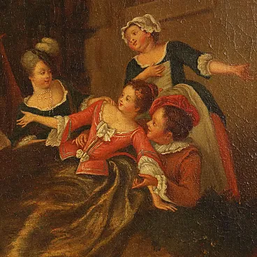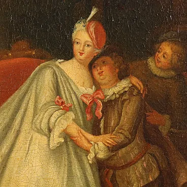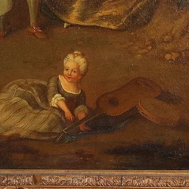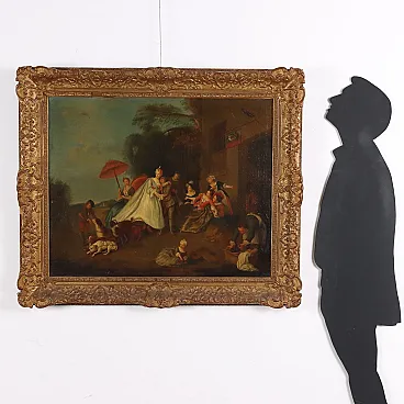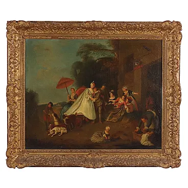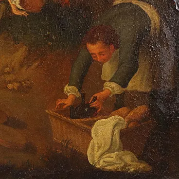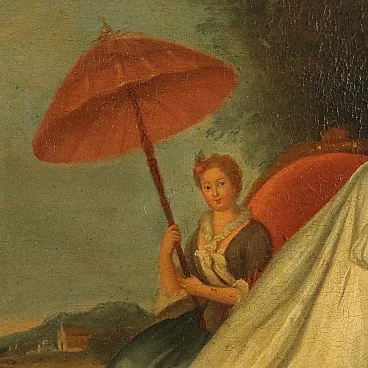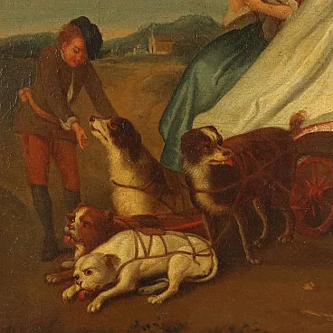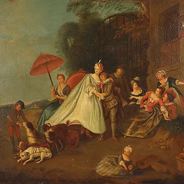Oil on canvas. French school of the 18th century. The scene depicts the moment in which an elegant young woman arrives at the site of an outdoor party: she is getting off her country carriage, pulled by dogs, gallantly helped by a young gentleman. Around her are the maid, still on the carriage, holding the parasol, the other girls in her entourage and the innkeeper who welcome the lady, and are preparing to set up the banquet with the food contained in the basket. The bright colors of the characters enliven the rural setting, while the white dress of the protagonist stands out and illuminates the scene. The painting, in the first canvas, shows traces of restoration and small losses of color. It is presented in an early 1900s frame.