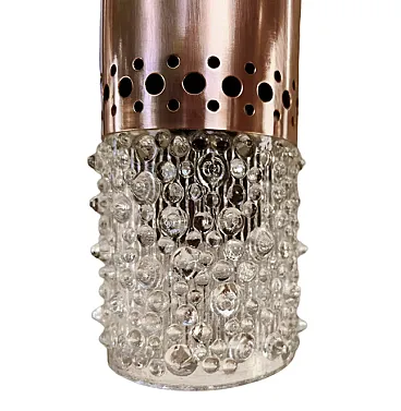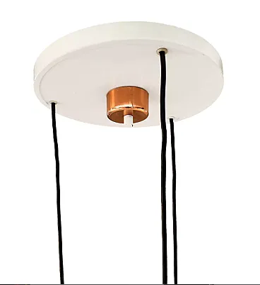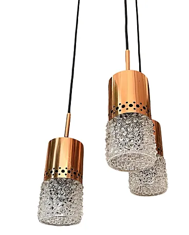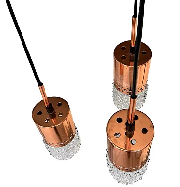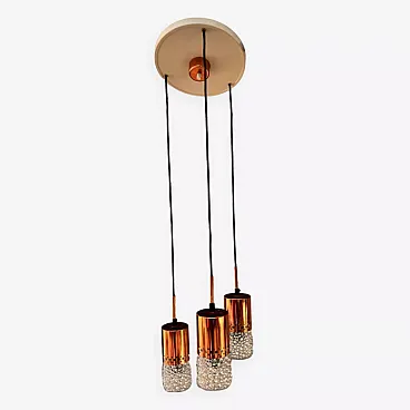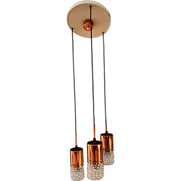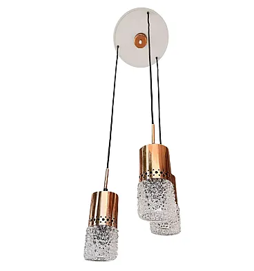 Type 4214 waterfall chandelier, produced in Germany between the 70s and 80s by veb narva leuchtenbau lengefeld. The lamp is made up of 3 suspended light points, the lampshades are made of pressed glass. The lampshades designed by frantisek pecena (20245 “candle wax”) were suspended on white cables, a beige plastic canopy and copper finishing elements. Lamp for 3 bulbs with small E14 socket up to 60 W. The chandelier has a preserved signature label. The condition of the lamp is very good, it has slight traces of use.