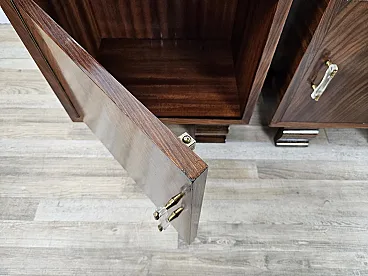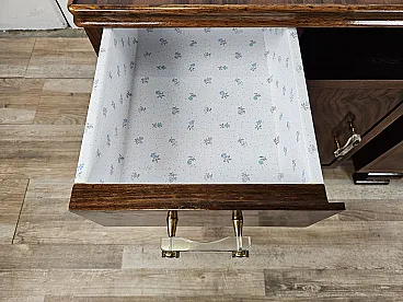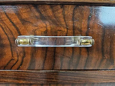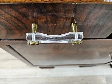 Elegant pair of Venetian briar bedside tables with drawer and open space compartment, complete the furniture with covered doors and enriched with transparent plastic handles with brass workmanship. Bedside tables produced in the early 1940s, of Italian origin (Veneto), finished and of high quality and workmanship. They have been polished with oil and shellac, normal signs of age and use.